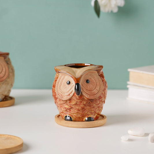 Orange Owl Ceramic Planter With Wooden Coaster