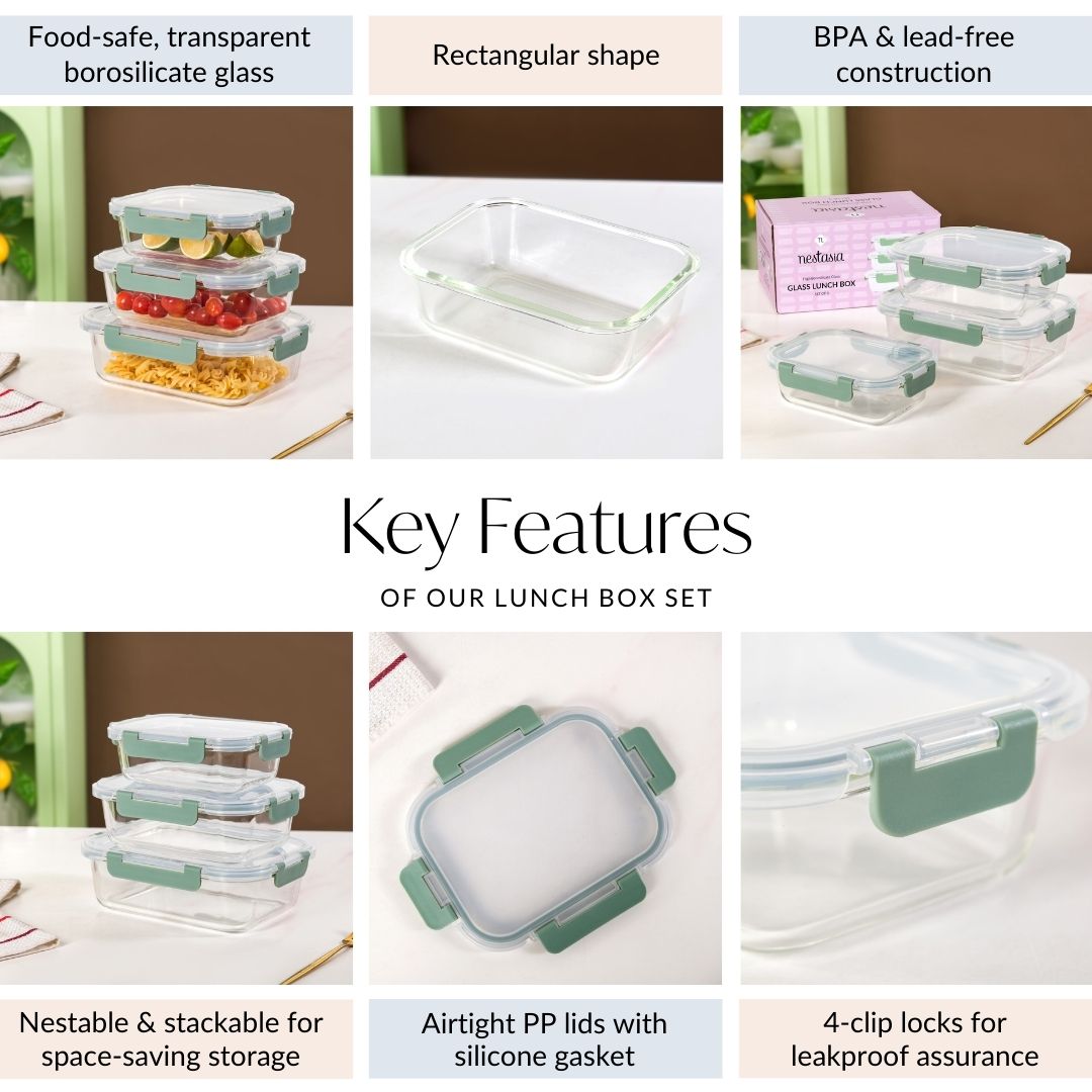 Nestro Leakproof Rectangular Food Storage Box Set Of 3 Green -