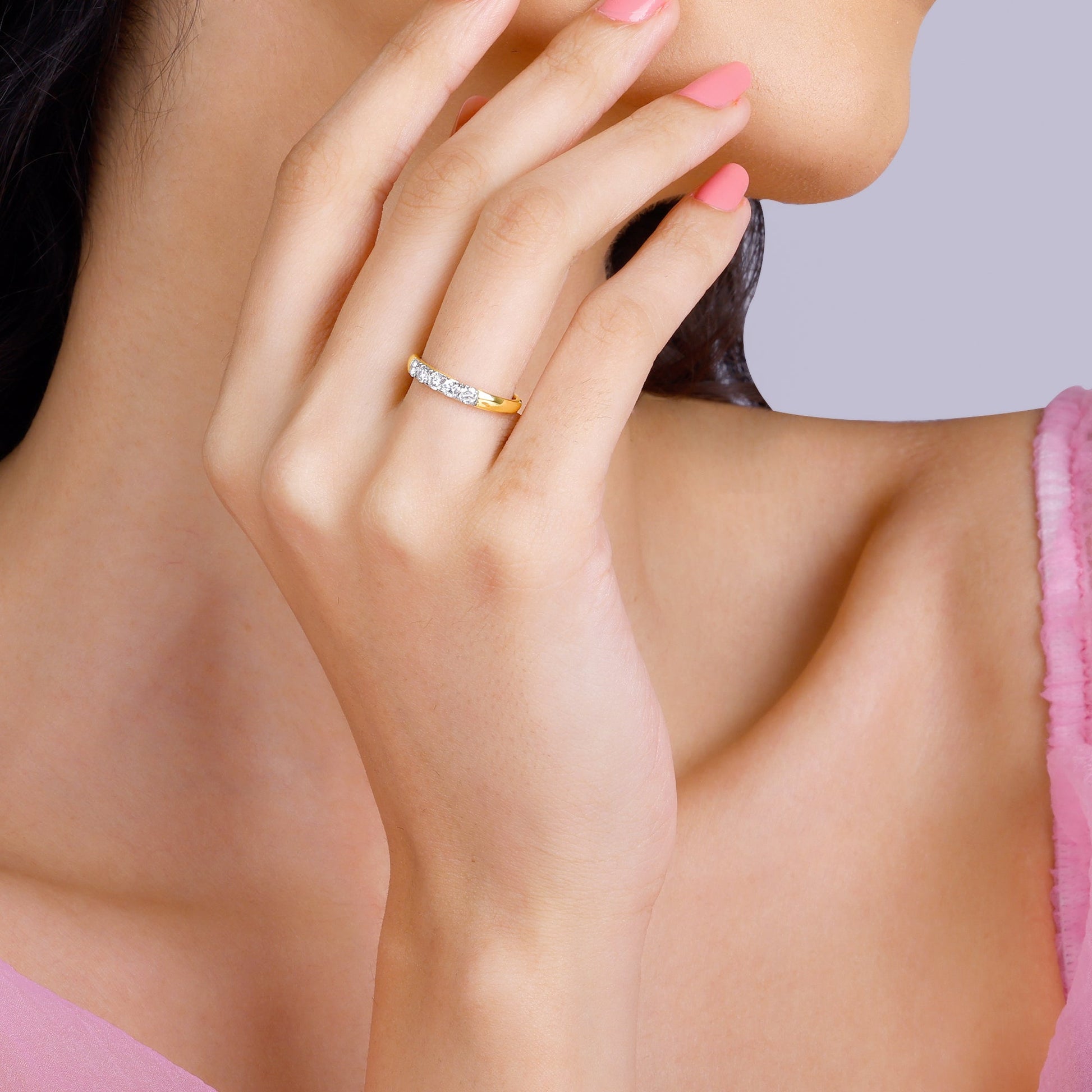 Style this diamond ring with a purple strapless dress.