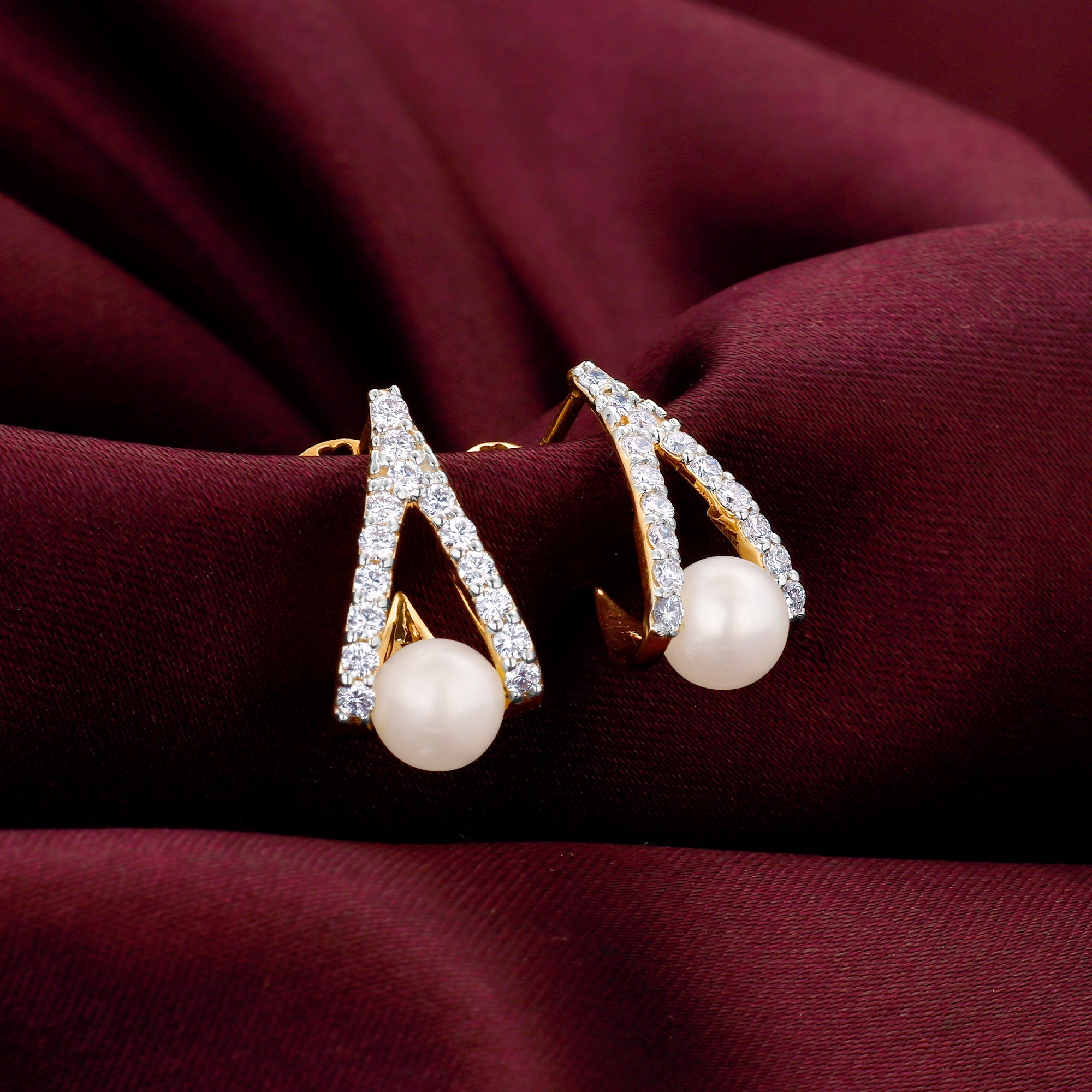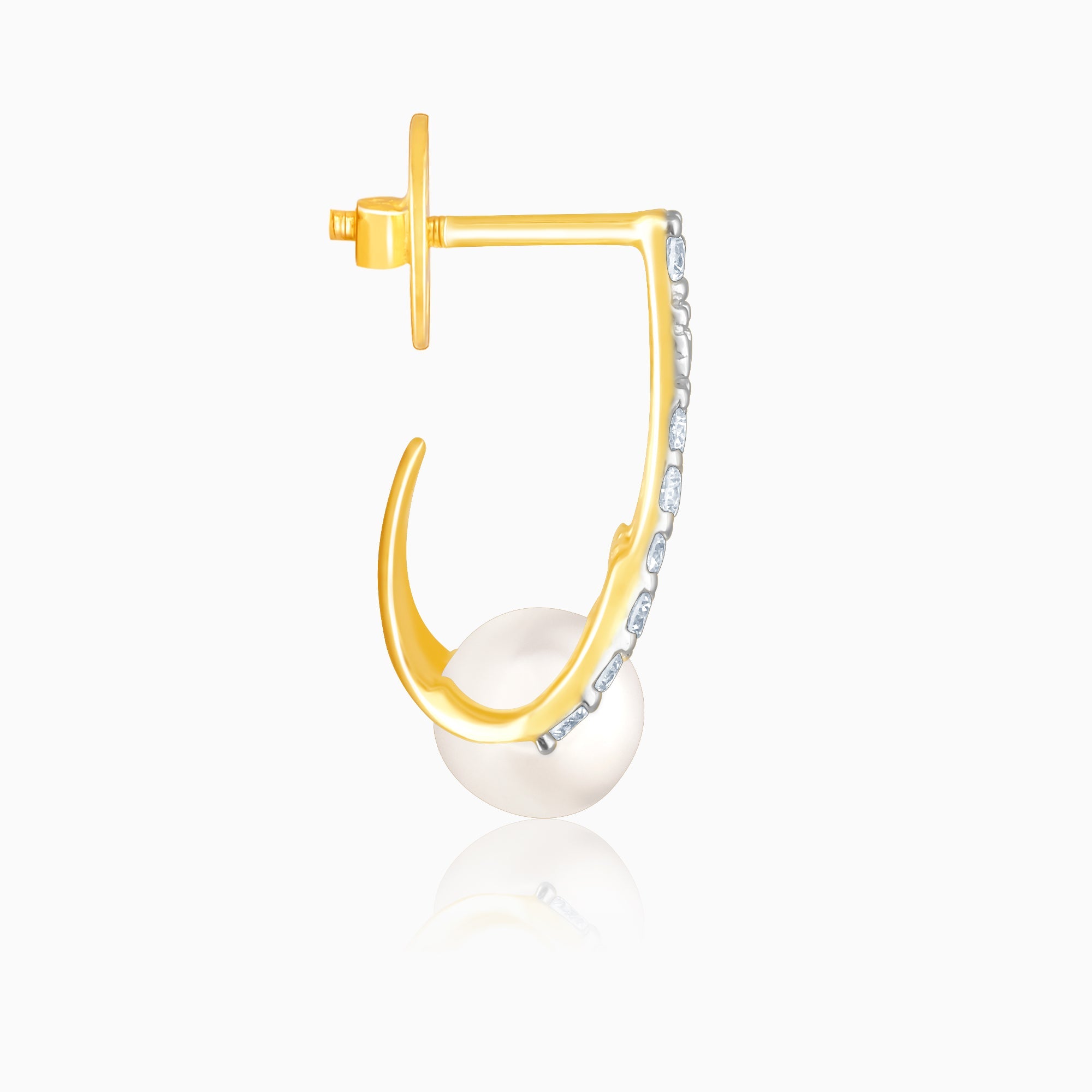 These earrings have an intricate design, resembling a hook holding a pearl by its edge, with lab grown diamonds studded all over the motif.