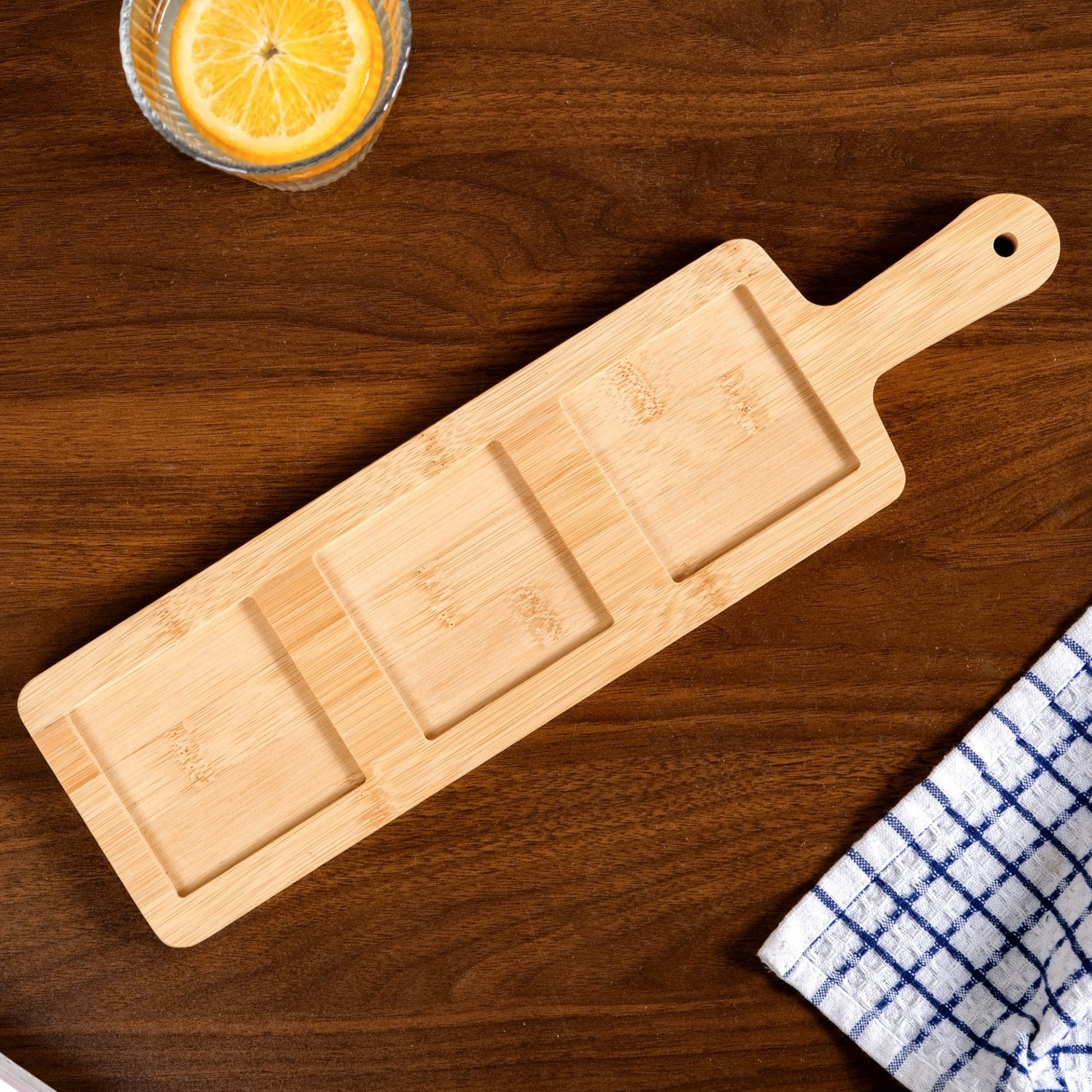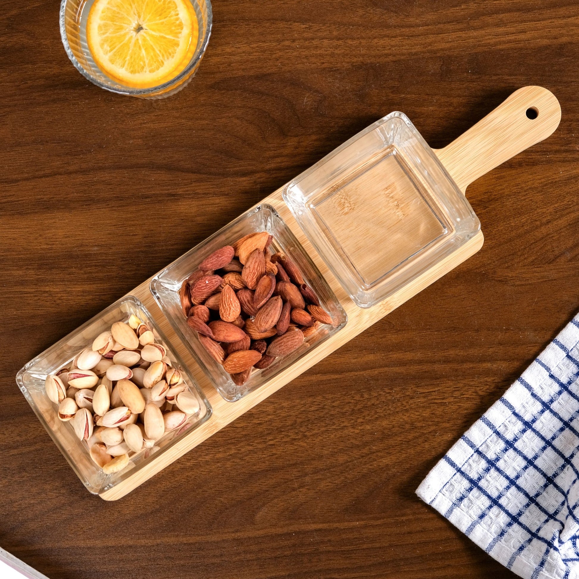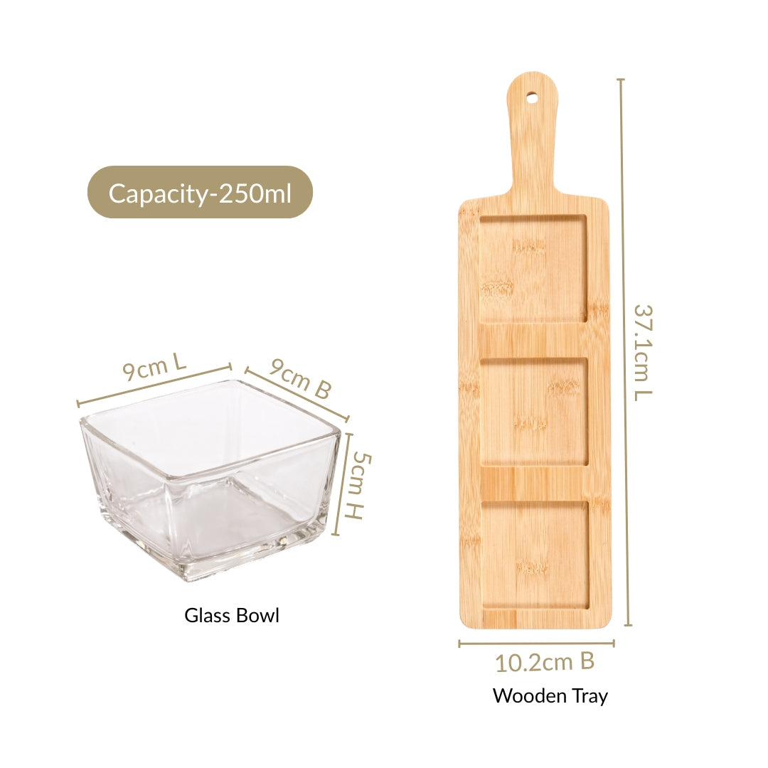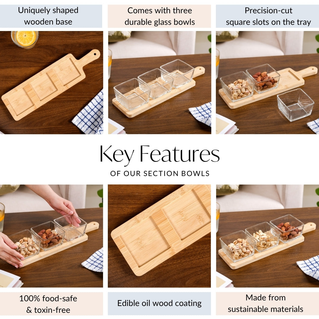 Design: At the heart of this set lies its uniquely shaped bamboo wood base, crafted from sustainable materials and reminiscent of a sophisticated serving paddle, complete with a convenient handle. This robust base features precision-cut square slots on the tray, designed to perfectly cradle the three accompanying durable soda lime glass bowls. These elegantly square-shaped bowls fit snugly within their dedicated slots, ensuring stability and a streamlined appearance. The wooden base is further enhanced with an edible oil wood coating, which not only brings out the rich, natural grain of the wood but also provides an added layer of protection and a subtle sheen.   For long-lasting use, wipe with a damp cloth and let it air dry.