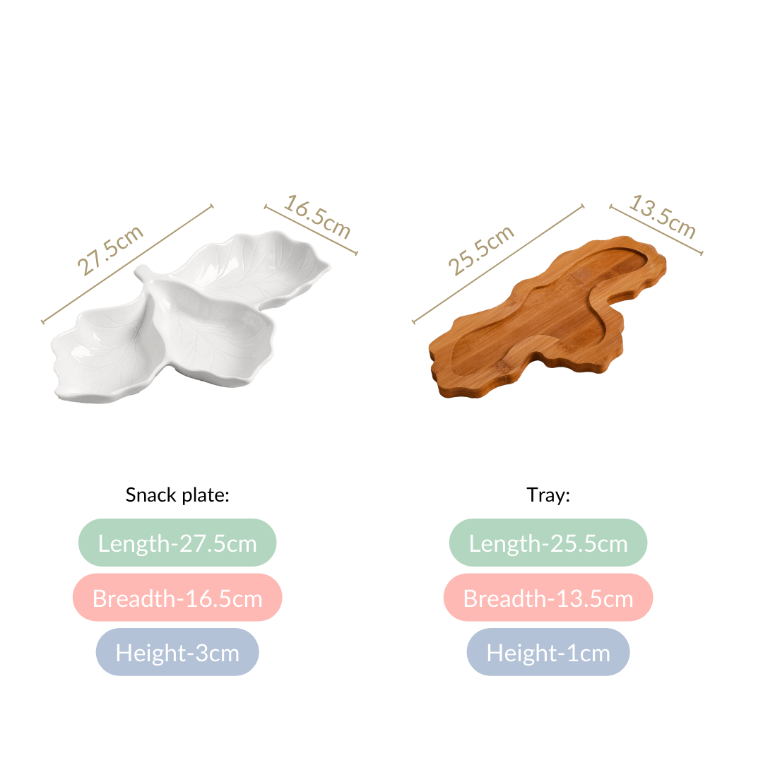 3 Section Leafy Ceramic Plate With Wooden Tray