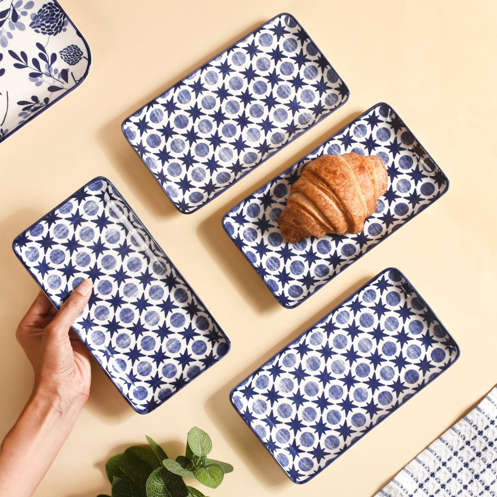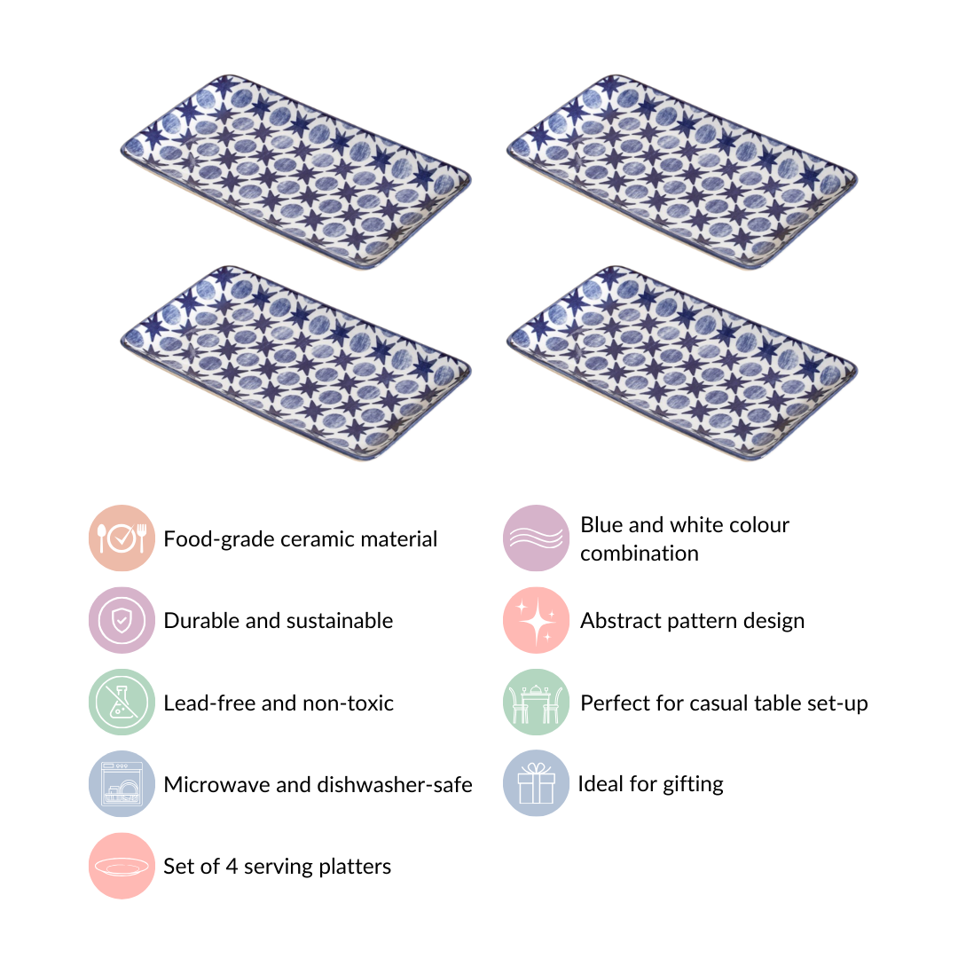 Discover the epitome of culinary sophistication with our set of 4 ceramic serving platters. Crafted from food-grade ceramic, these platters or long plates are both durable and sustainable, ensuring long-lasting use. Lead-free and non-toxic, they're safe for your family and the environment. Their microwave and dishwasher-safe design adds convenience to your daily routine. Featuring a charming blue and white colour combination with an abstract pattern, these ceramic platters are perfect for casual table settings and ideal for gifting. Add a touch of elegance to any meal and impress your guests with these versatile and stylish serving essentials.
