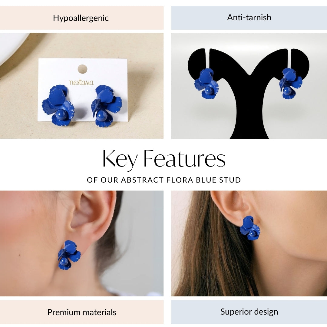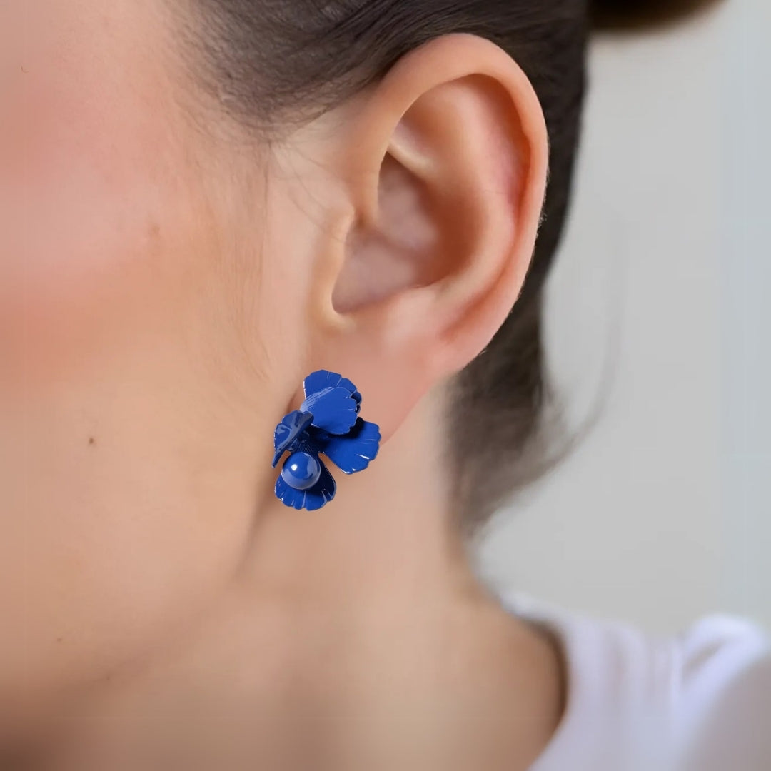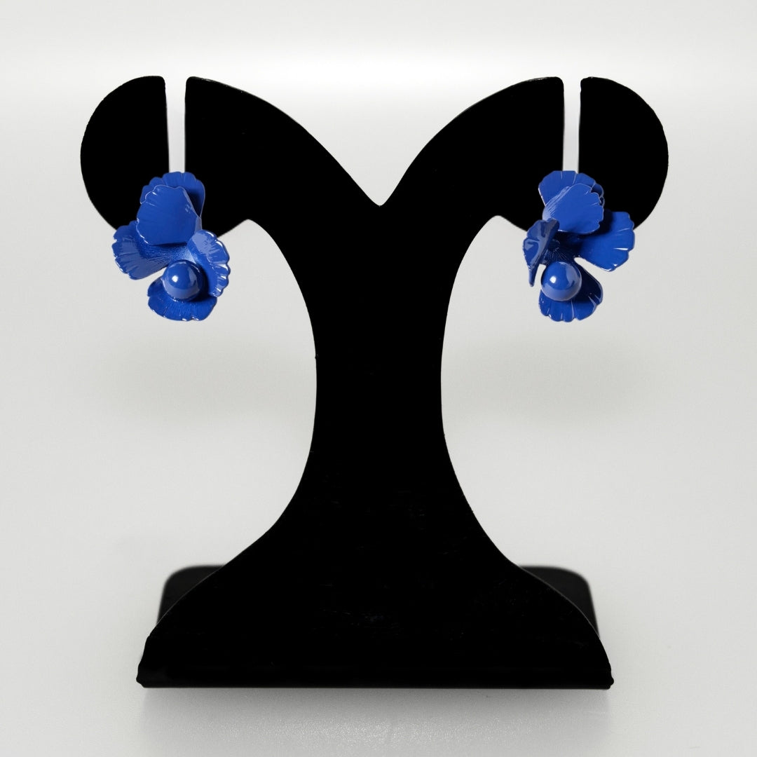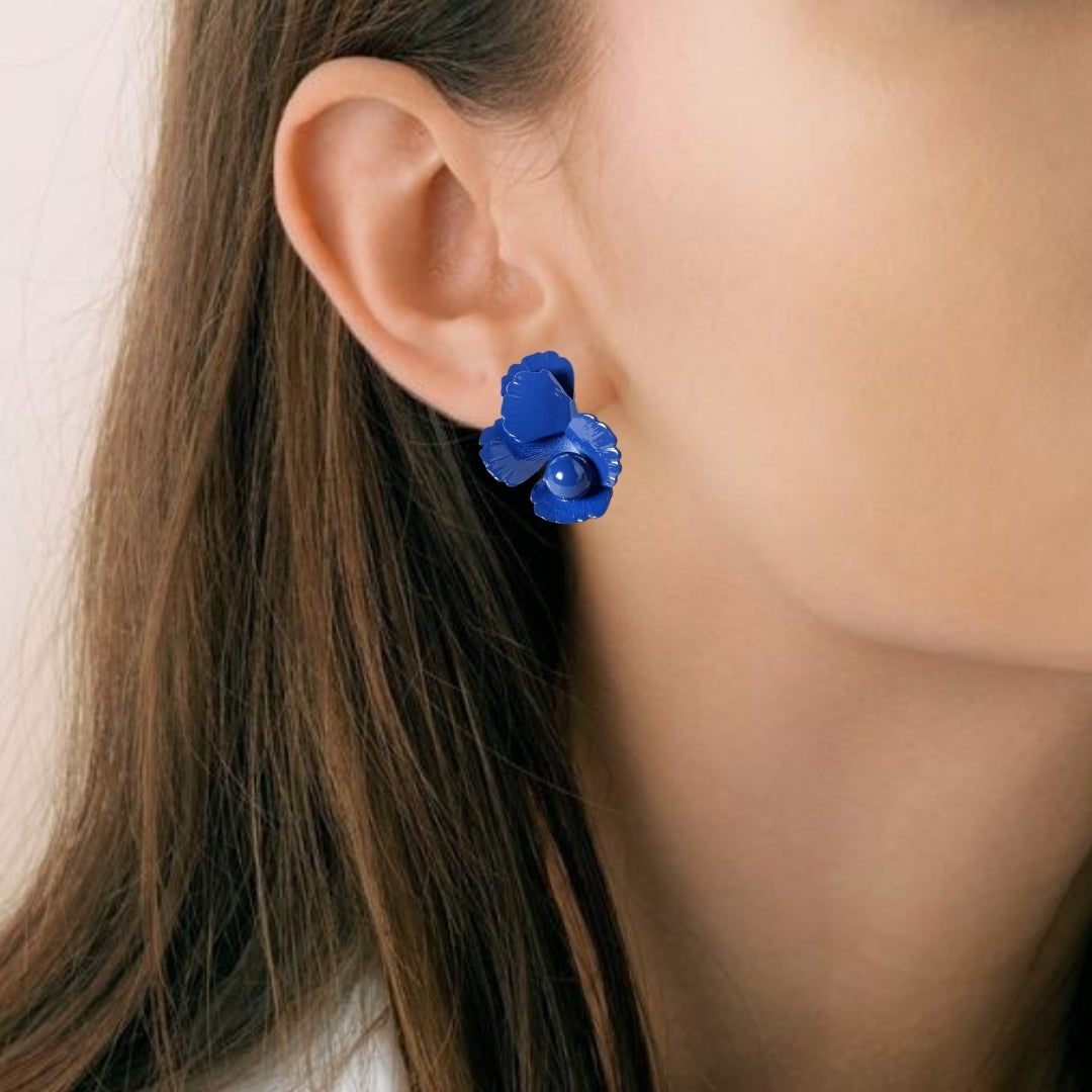 This blue floral abstract stud is a striking blend of nature and art. Crafted from metal, its petals curve and crumple, adding an intriguing, dynamic touch. One petal features a small blue metallic ball, creating a unique focal point.