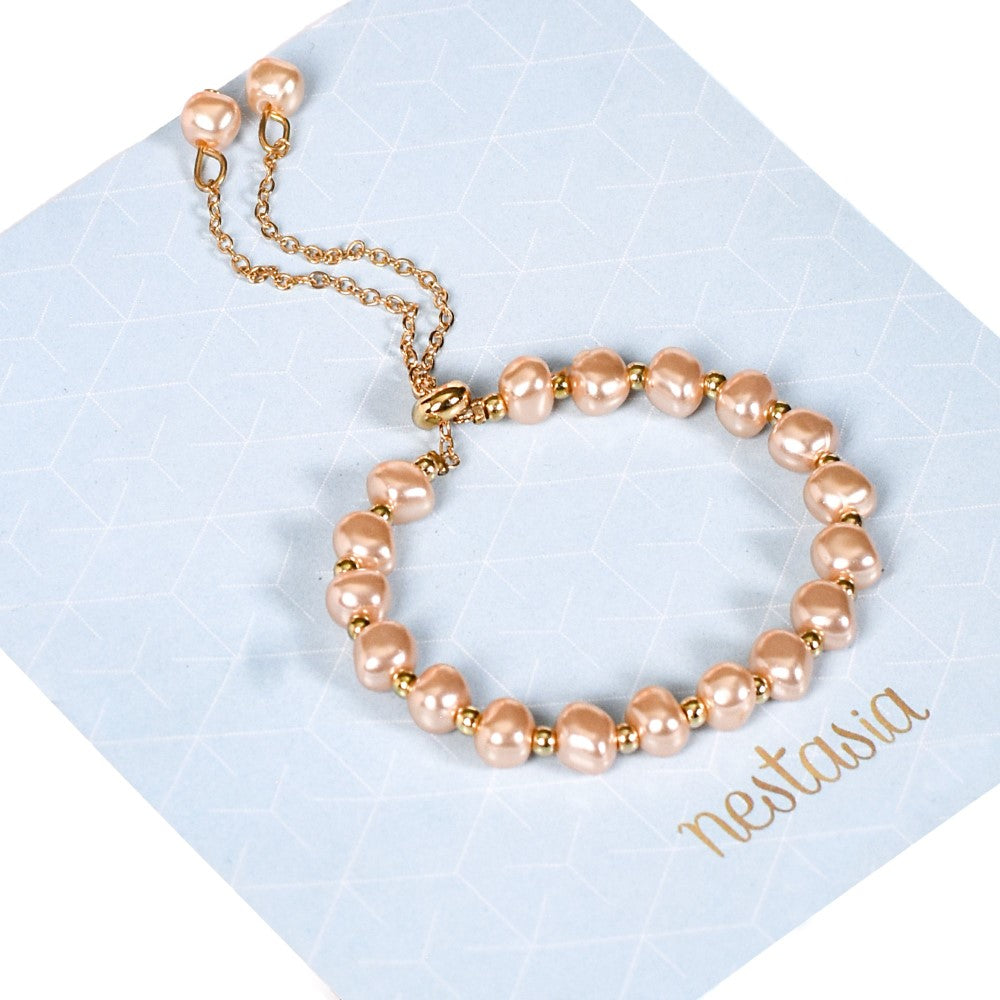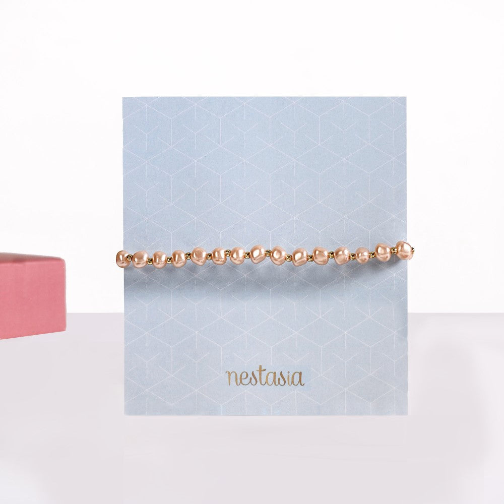 This bracelet is like a little party for your wrist! Crafted with attention to detail, this charm bracelet is adorned with alternating glossy artificial peach pearls and dainty golden beads, thus, perfectly adding a delicate elegance to your outfits. Beautifully displayed on an opulent gold chain, the bracelet also features matching peach pearls dangling playfully at the ends, creating a dynamic feel that catches the eye. Whether you’re dressing up for a night out or adding a touch of sparkle to your everyday look, this bracelet is versatile enough to complement any style.
