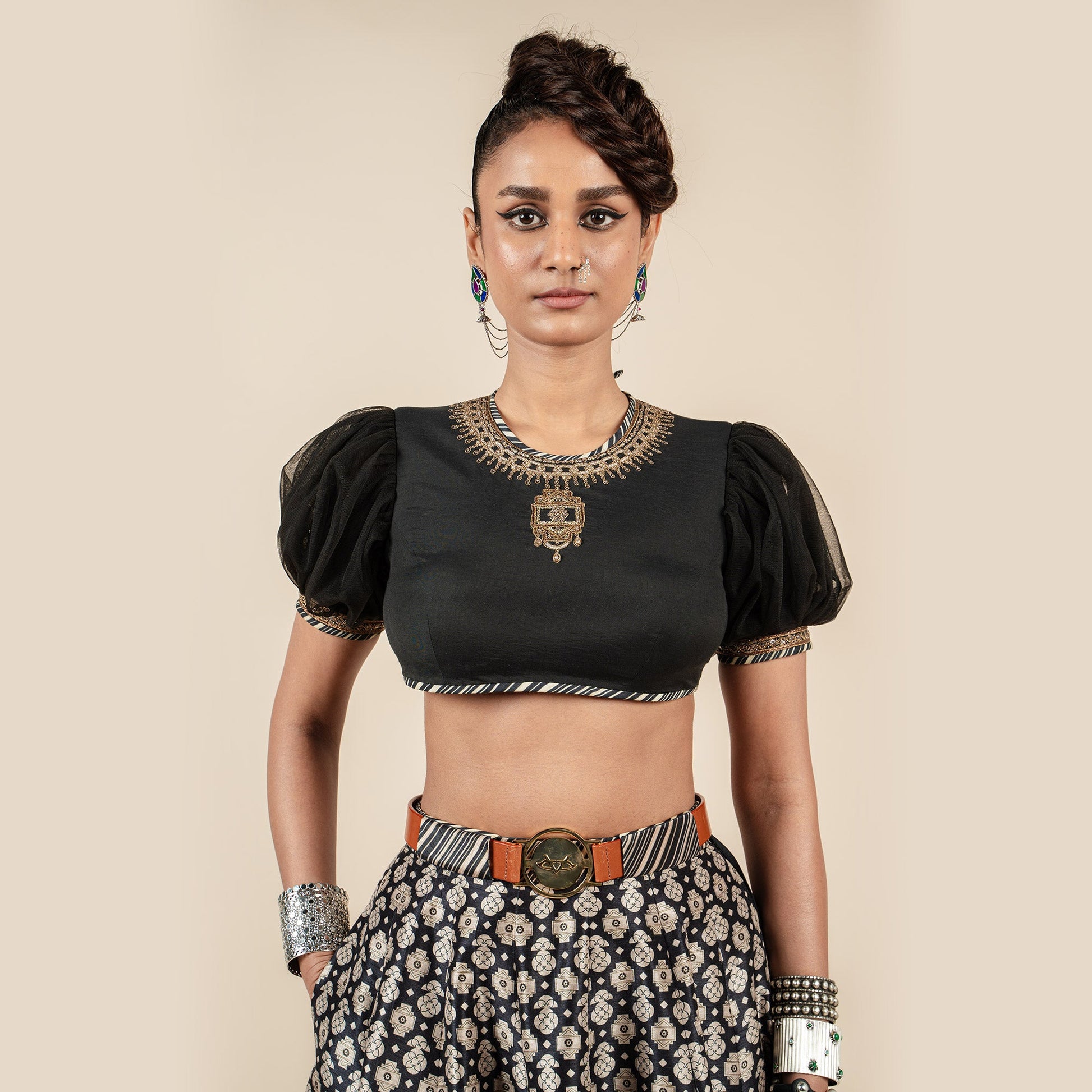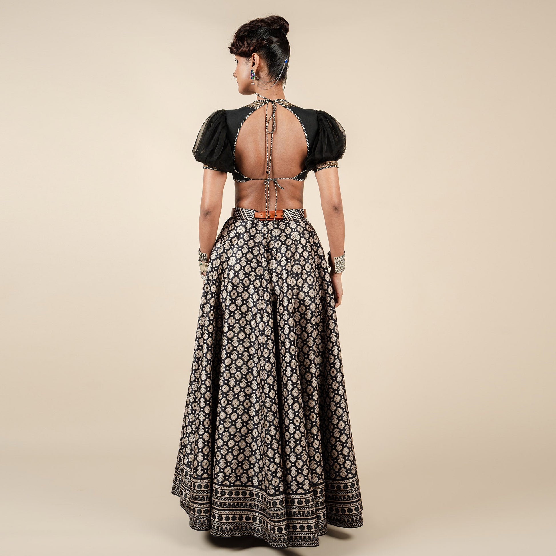 The skirt set features a blouse with elegant puff sleeves, adorned with antique gold embroidery on the sleeve borders. The jewel neck is also embellished with intricate antique gold embroidery, complemented by striped piping for a refined touch.