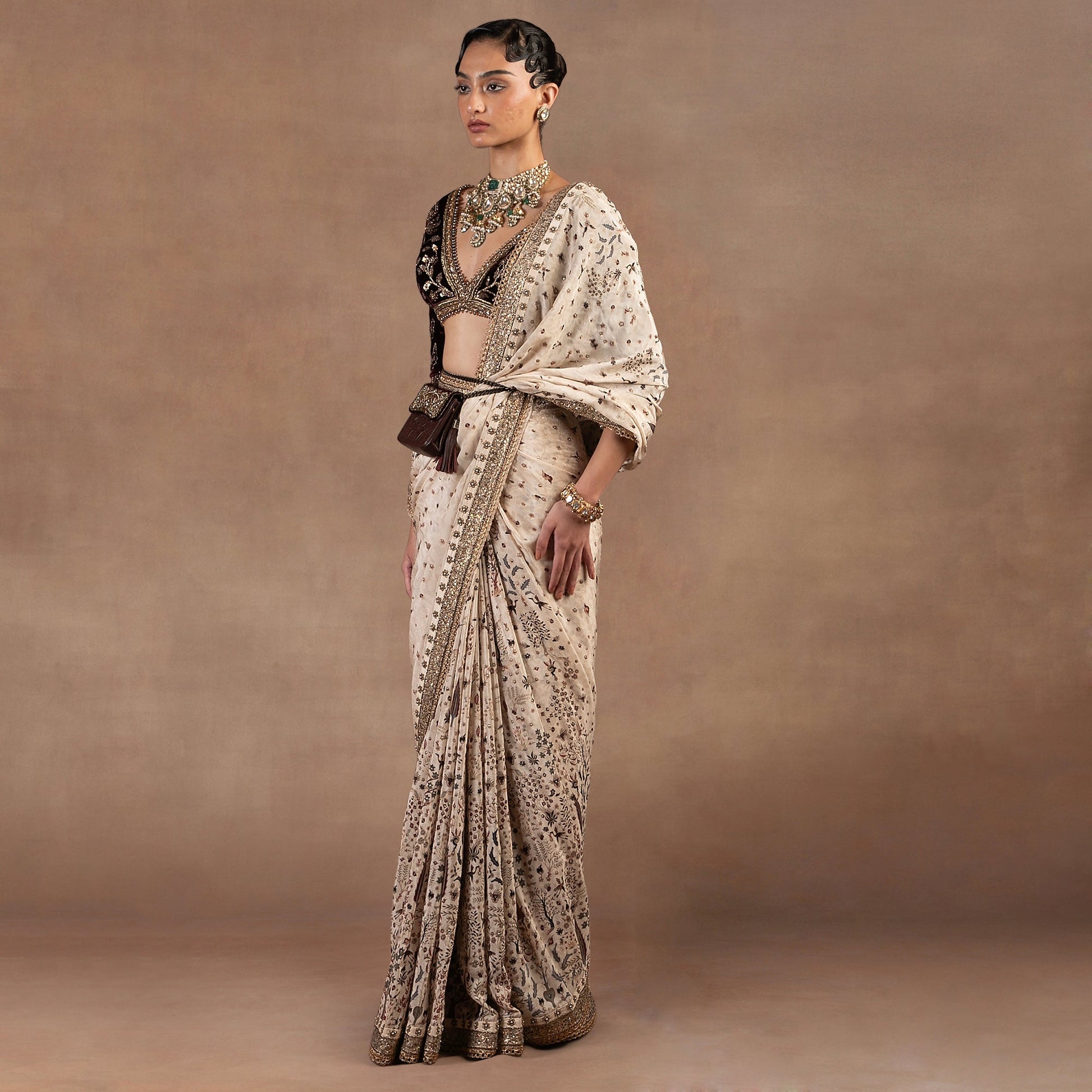 This saree set features a rich burgundy blouse adorned with antique gold metallic embroidery enhanced with zari, sequins, and crystals. The ivory saree is detailed with a subtle print, crystal lifting, and antique gold metallic embroidery complemented by zari and sequins. The border showcases assorted sequin embroidery along with a scalloped edge, adding refined texture and dimension to the ensemble.
