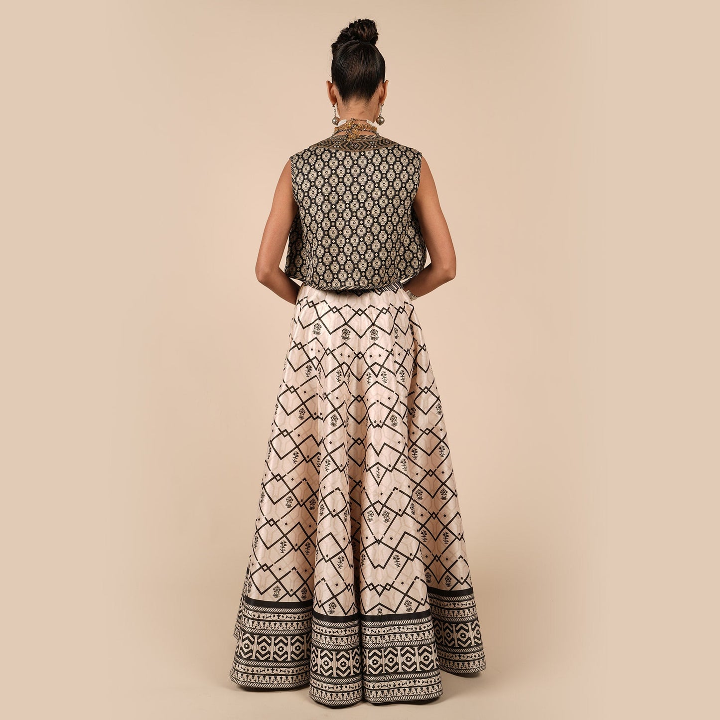 The Gilet Jacket features a captivating digital print that adds a modern touch. The borders are elegantly adorned with antique gold embroidery, complemented by striped pattern piping for a refined finish.