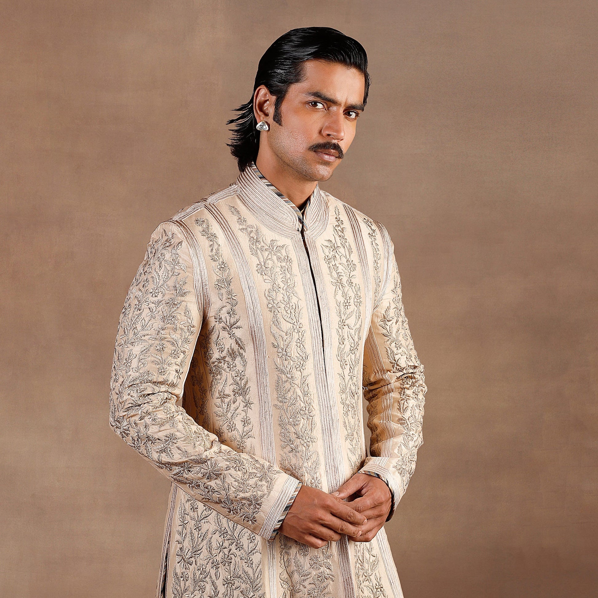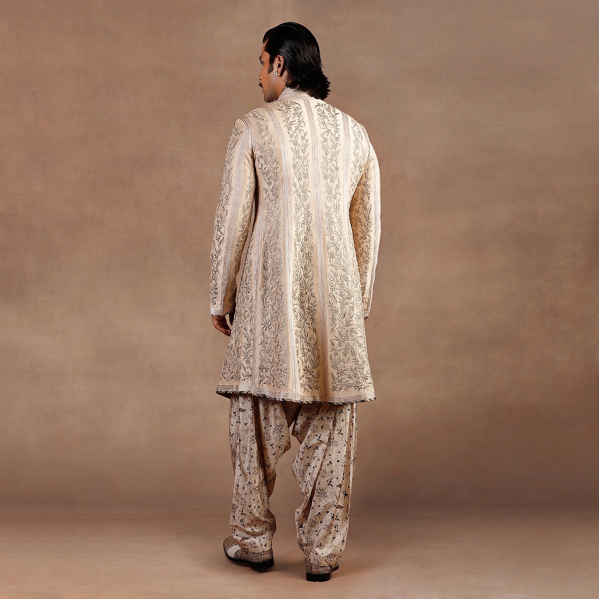 Crafted on an ivory base, this sherwani features tonal resham threadwork throughout, accentuating its angular silhouette. It is paired with a printed salwar, offering a subtle contrast that complements the ensemble’s refined detailing.