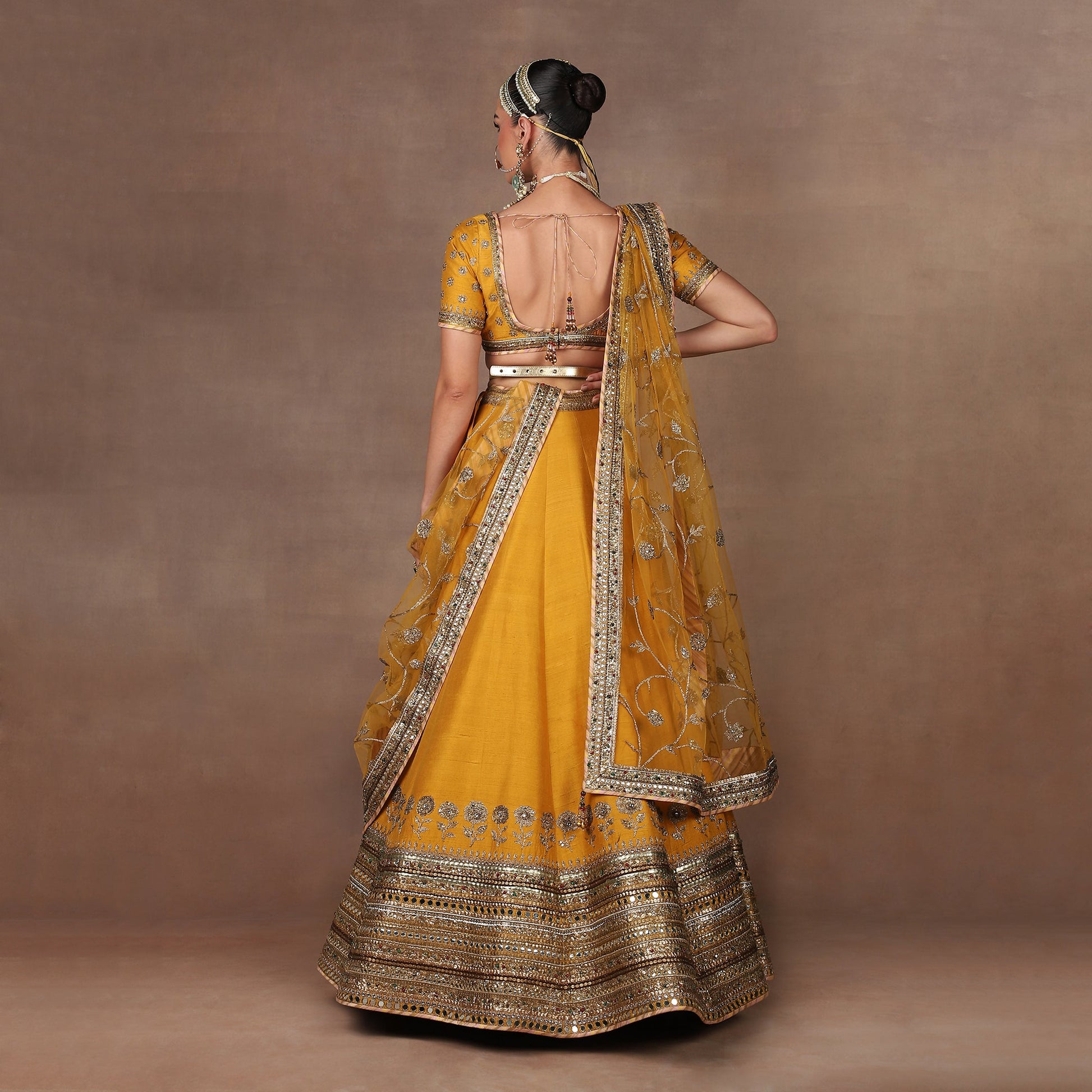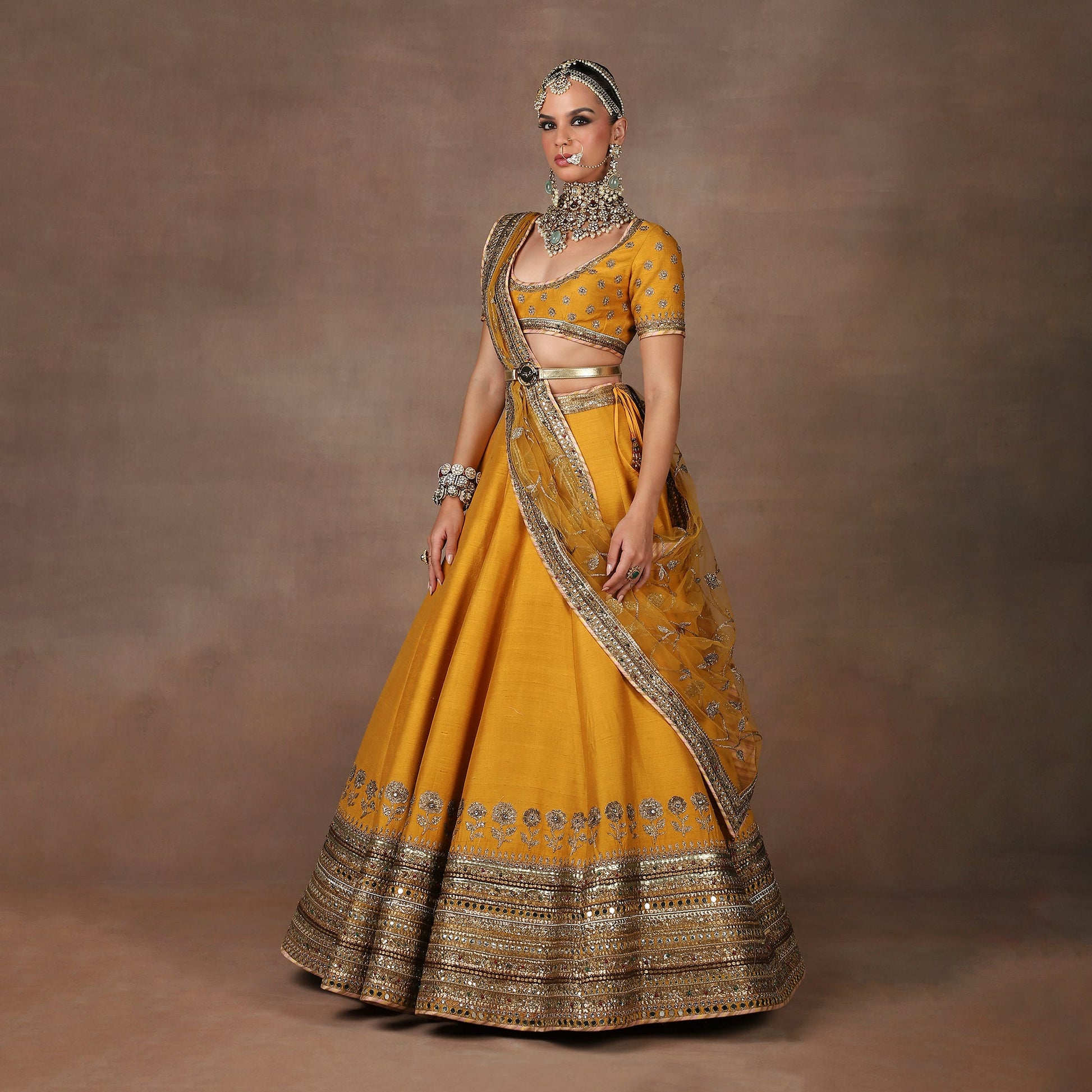 This lehenga set combines the rich warmth of amber yellow and gold, featuring antique gold metallic embroidery, crystals, and sequin work. The design is enhanced with jeweled embroidery and intricate Kasab detailing. Paired with an embroidered tulle stole, it exudes a regal, refined charm.