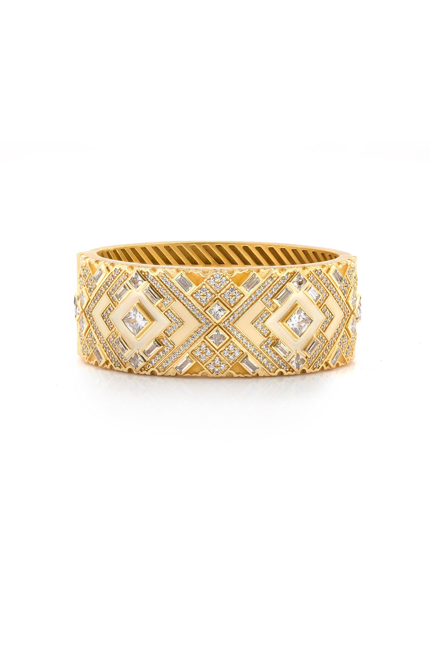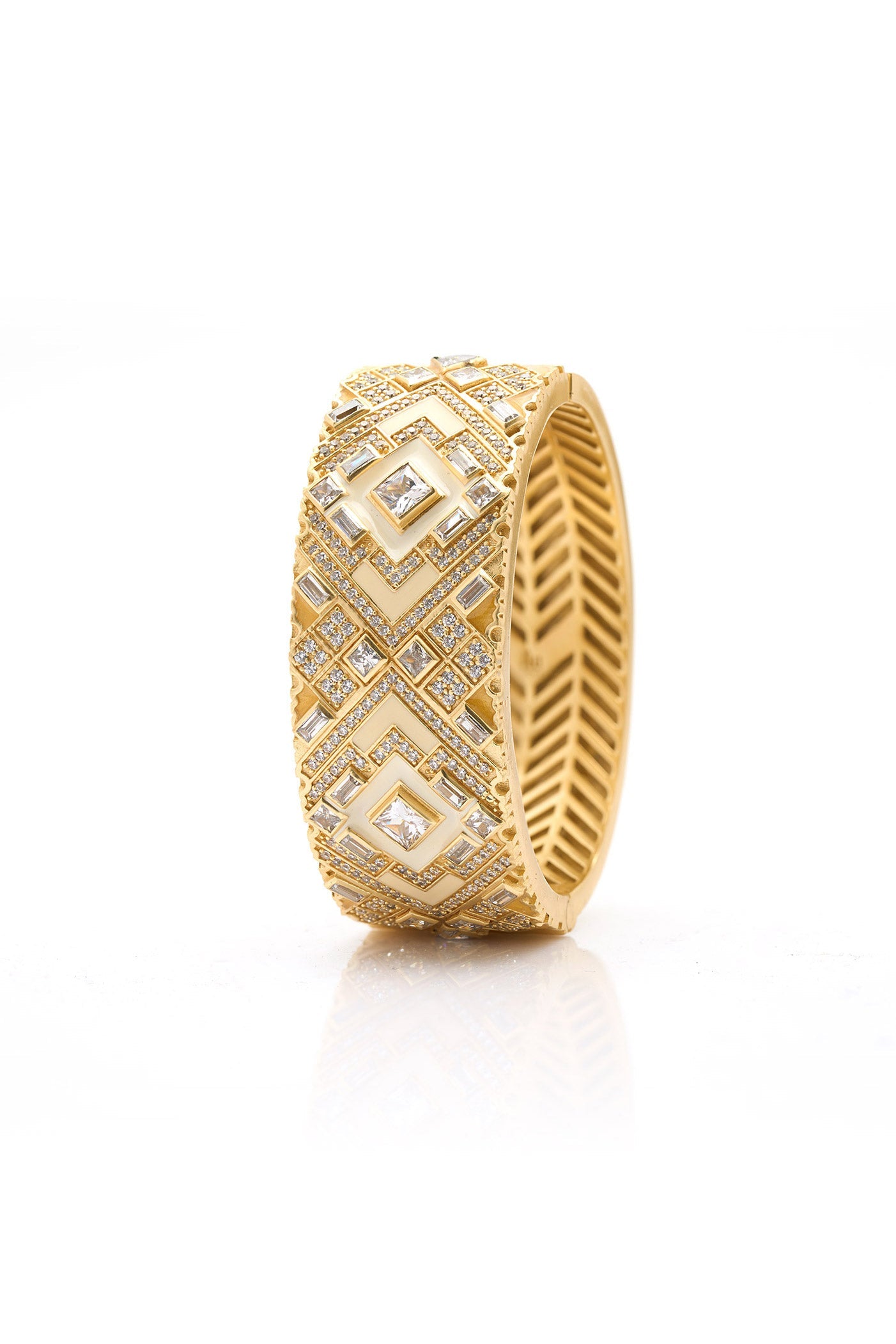 High-grade zirconia stones juxtapose the designer's signature chevron pattern with iconic Art Deco motifs.