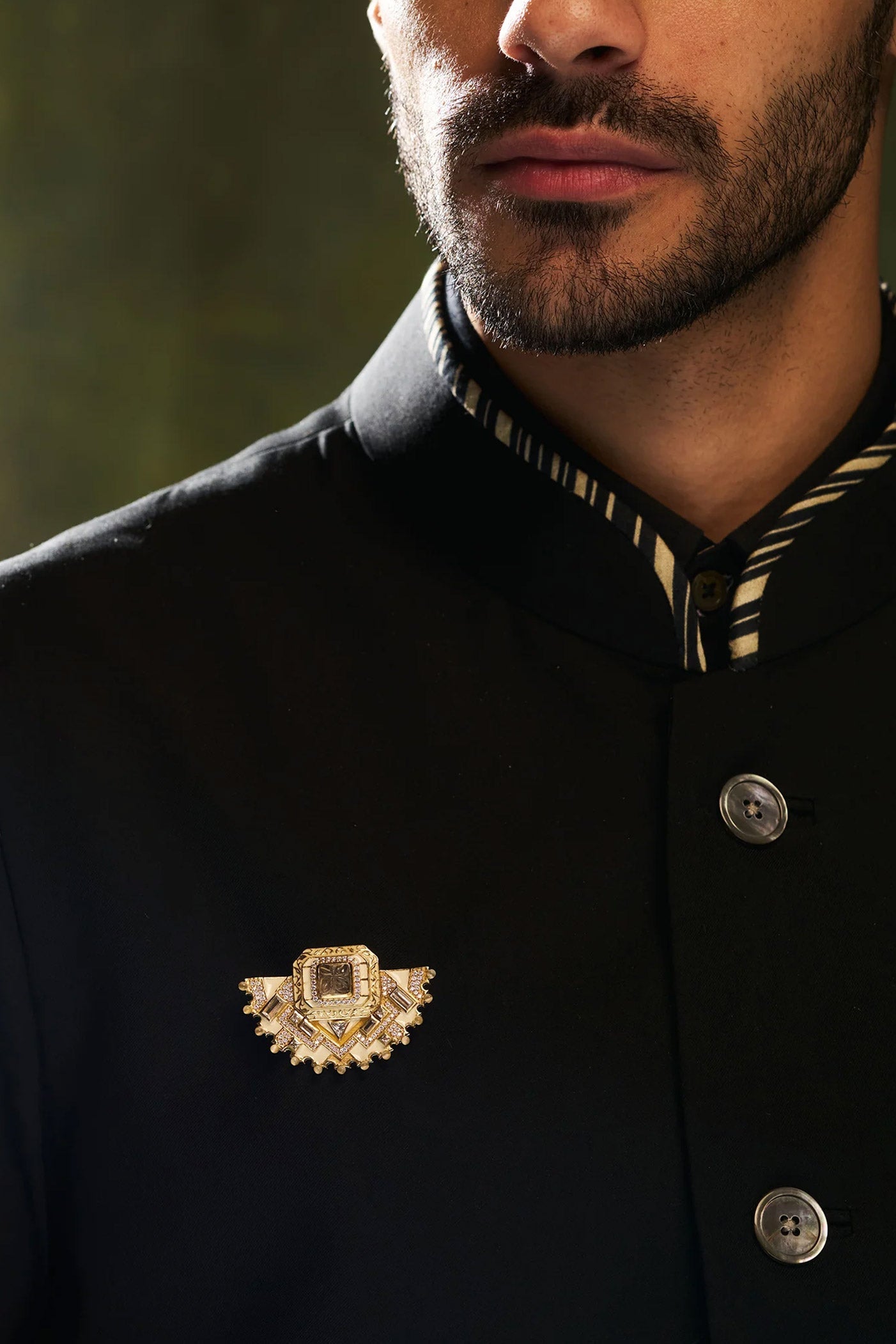 This Art-deco inspired unisex brooch is made of carved semi-precious stones, lined with high-grade zirconia. The chic enamel work further accentuates the design language of the jewelry.