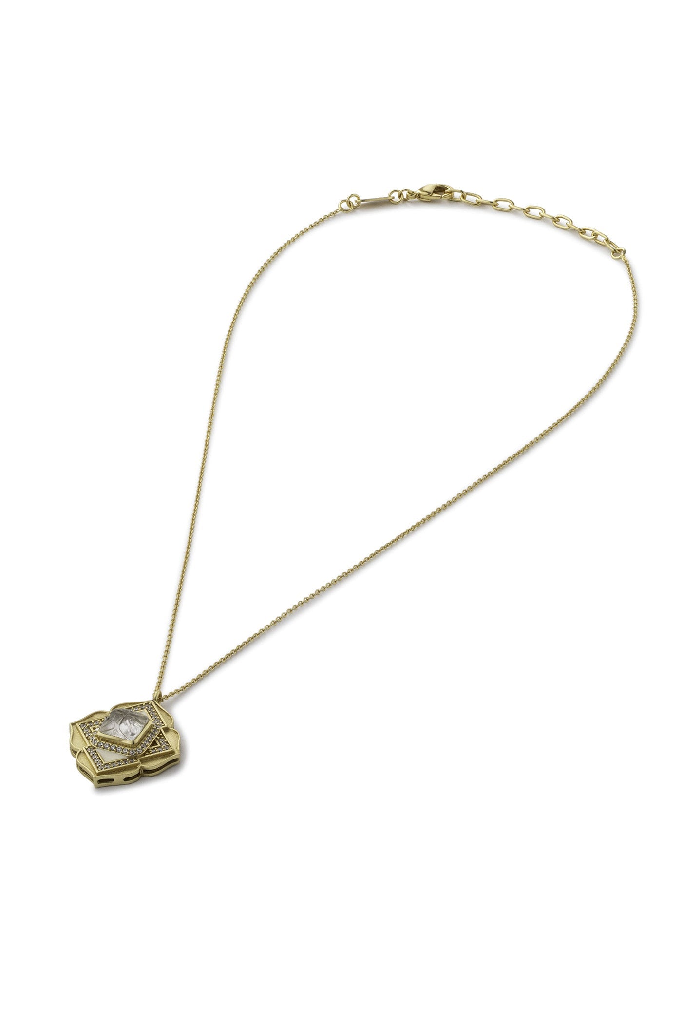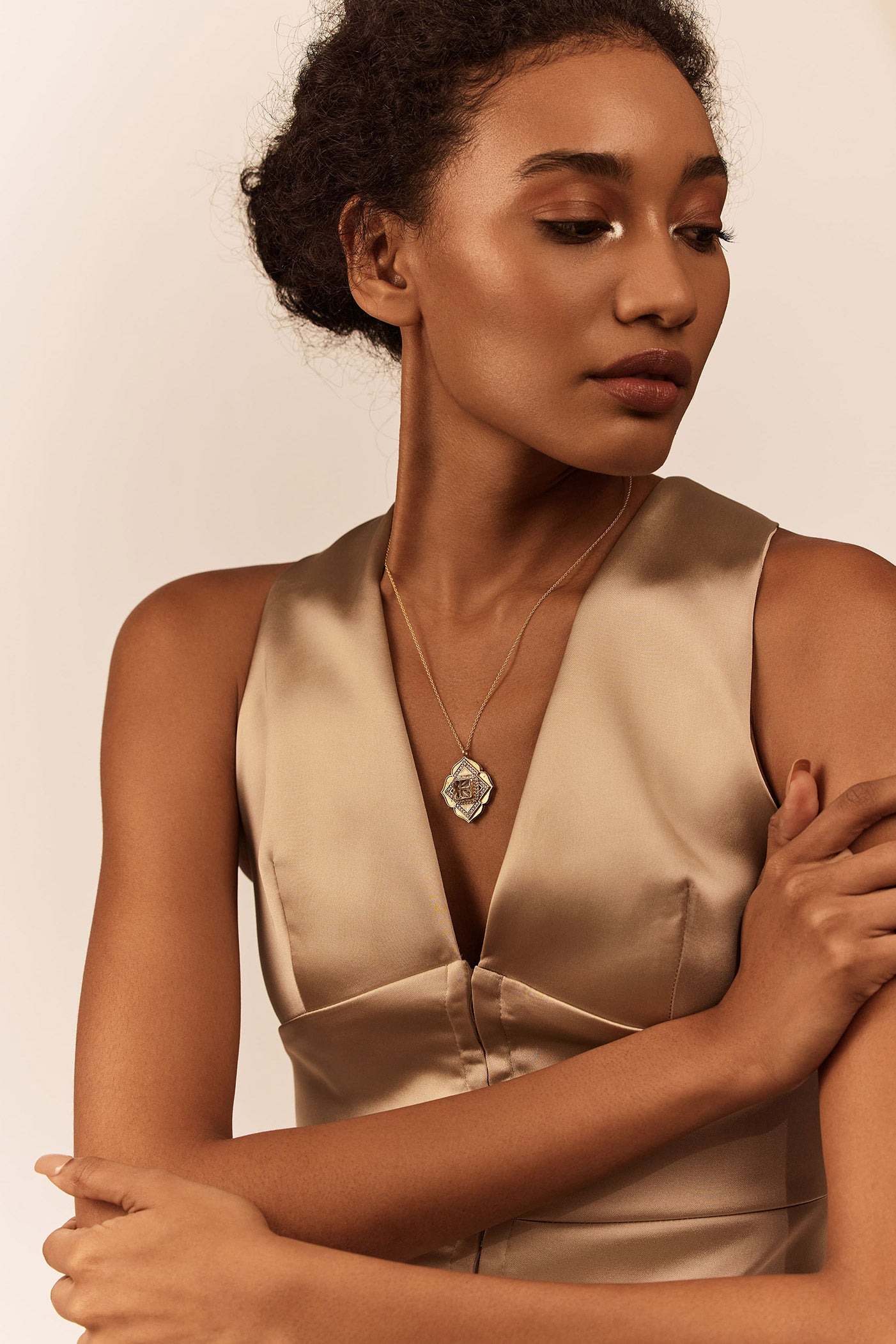 A striking necklace featuring edgy geometric design, intricately carved semi-precious stones, and rich enamel work.
