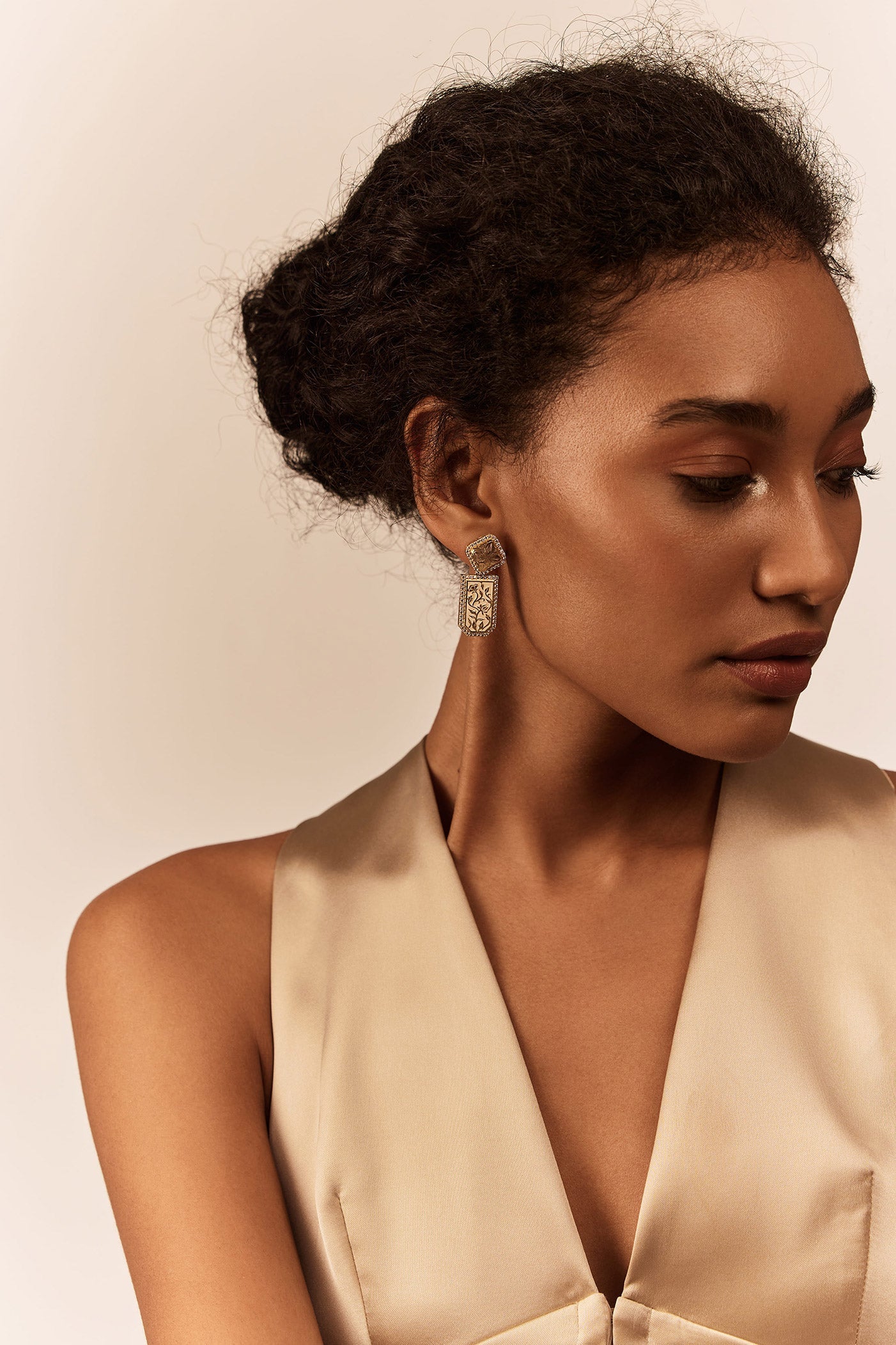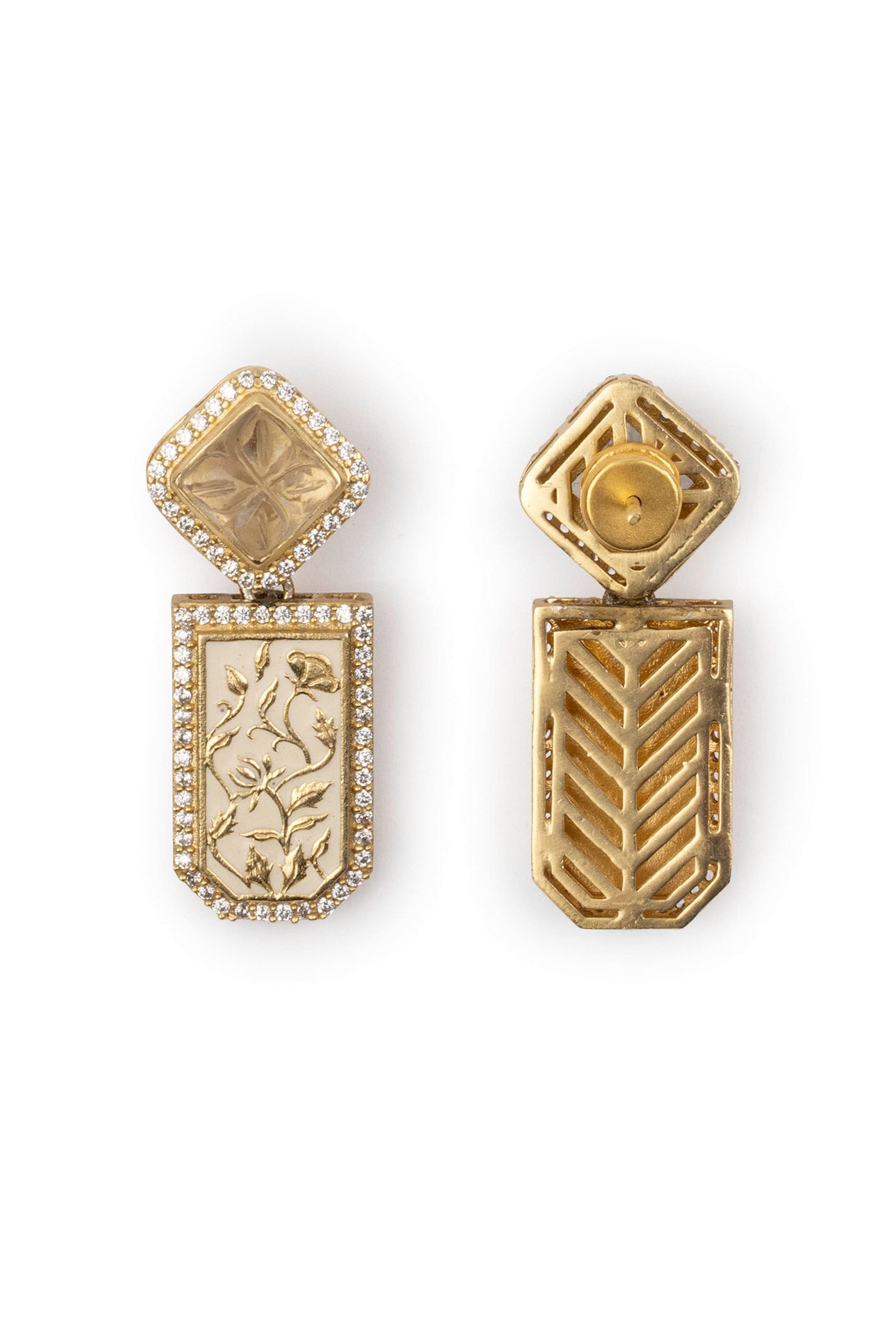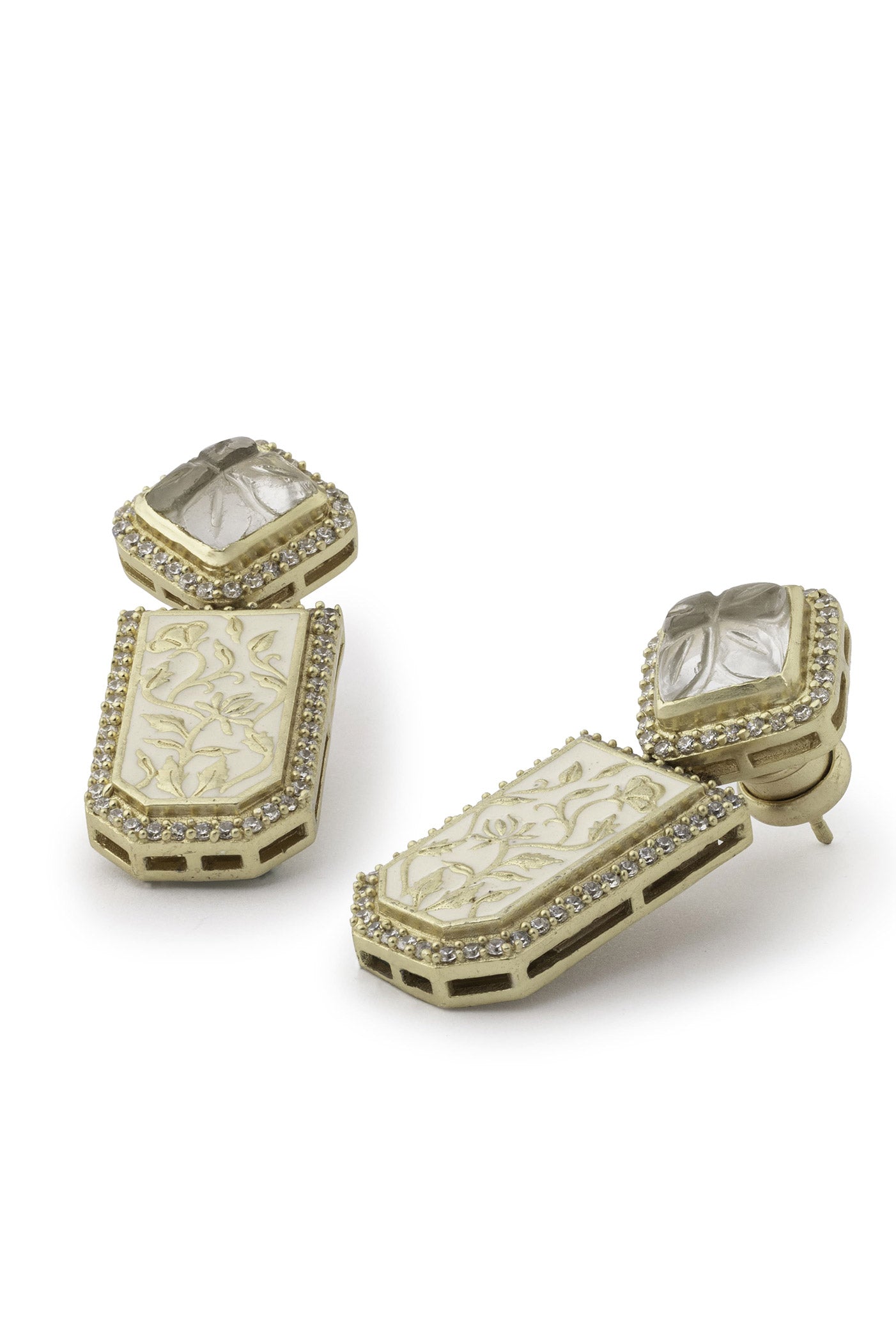 This dainty yet statement pair of earrings is made of high-grade zirconia and semi-precious carved stones, interspersed with intricate enamel work.