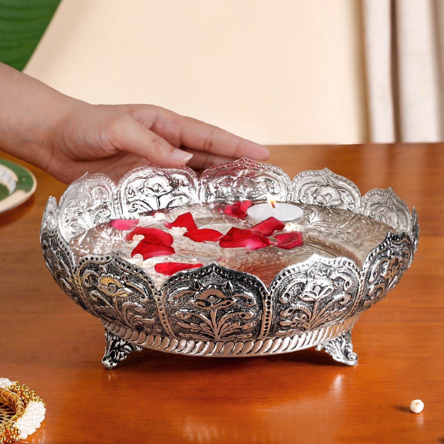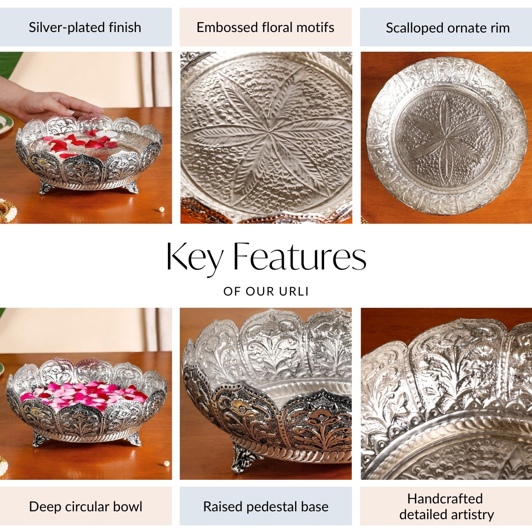 Design: The handcrafted urli has a glossy silver-polished surface with detailed embossed floral motifs across the body. Its deep circular bowl creates ample depth for candles or blossoms, while engraved leafy accents enhance the richness of the design. The scalloped rim with ornate carved edges adds elegance to its structure. A raised pedestal base ensures stability and balance, while the medium weight metallic body offers durability. Compact in size, the urli becomes a versatile decorative bowl for varied home settings.