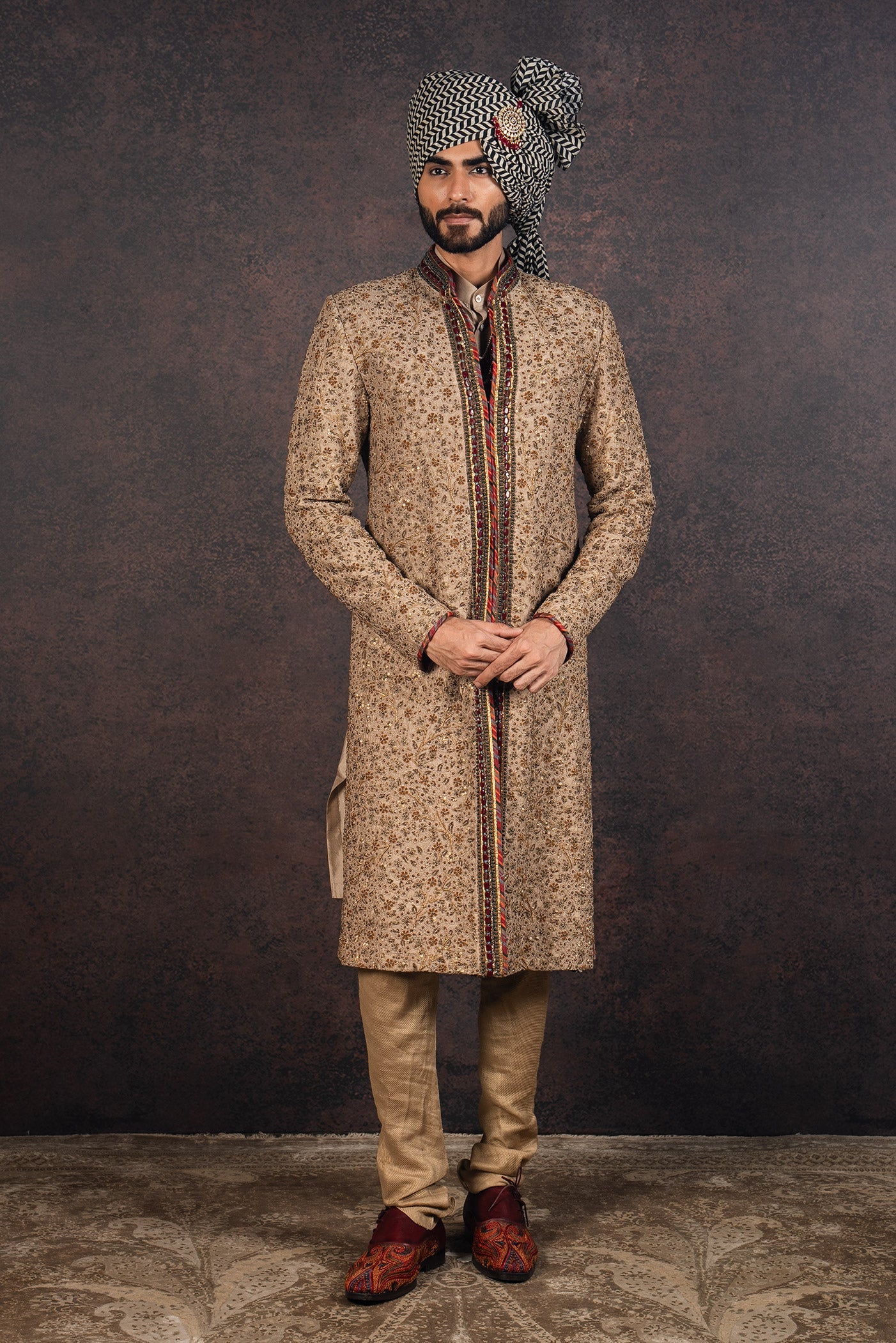 The Antique Gold Sherwani Set embodies classic sophistication with its luxurious detailing. Adorned with intricate antique gold embroidery, dori dabka work, and kasab embroidery, it features elegant sequins, semi-precious stones, and delicate resham threadwork. This ensemble offers a regal and timeless appearance.