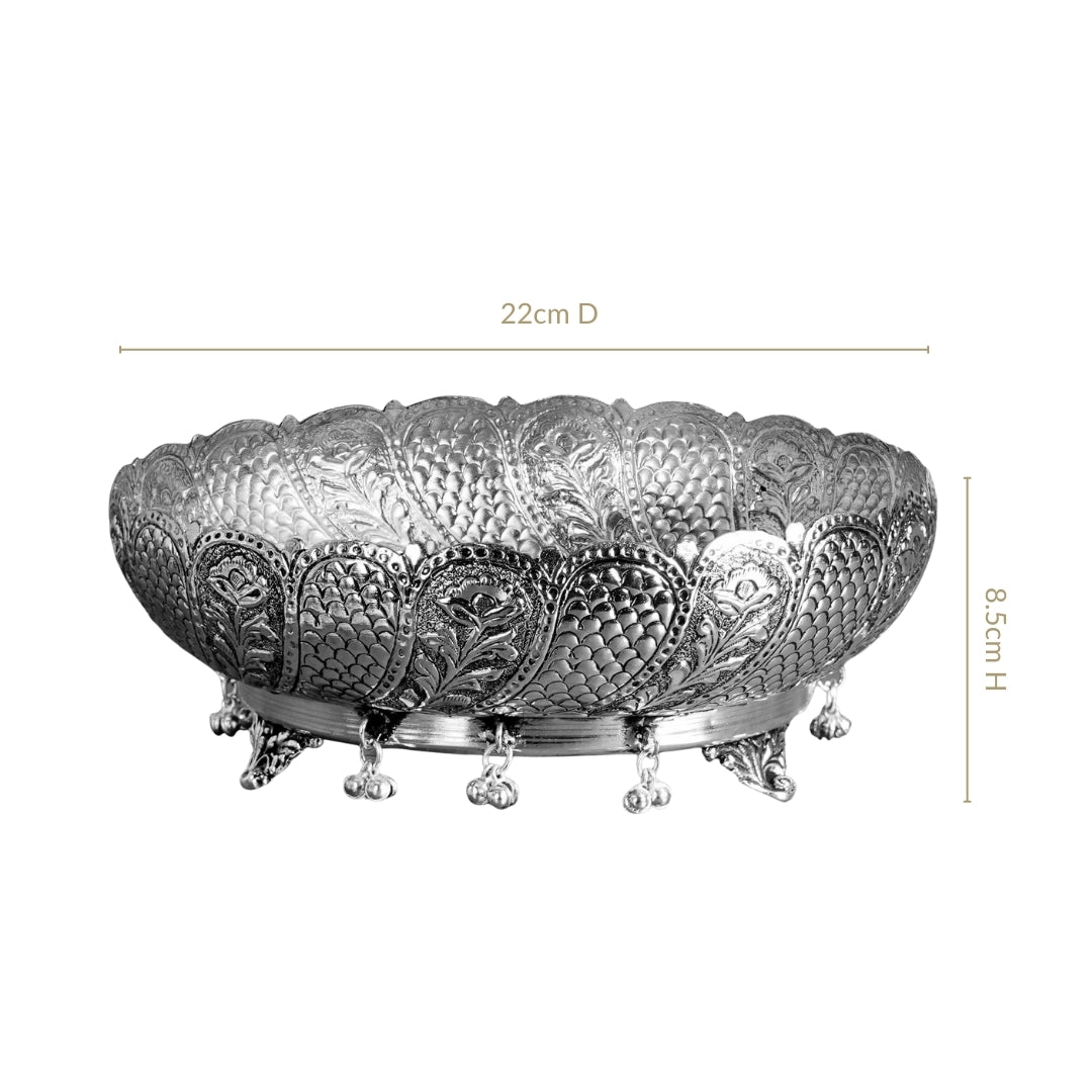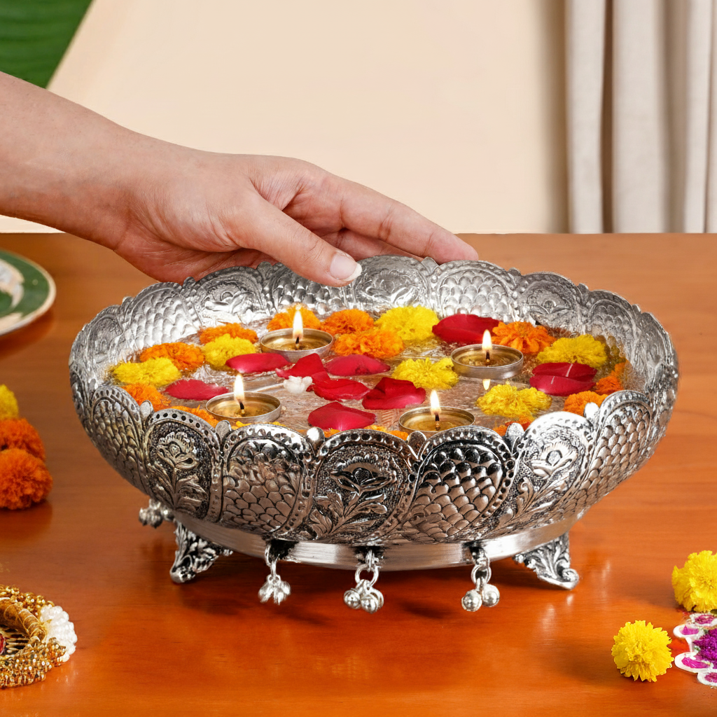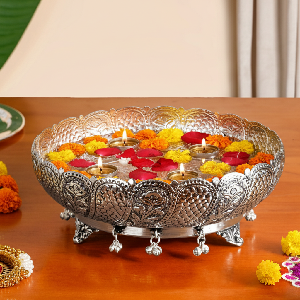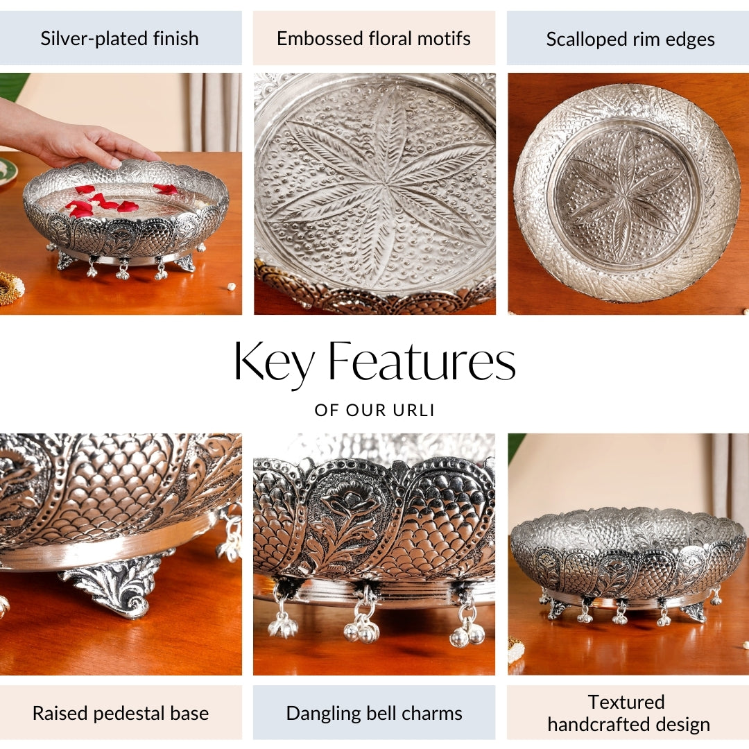 Design: The urli features a silver-polish surface with a glossy shine and embossed floral motifs that stand out against a textured, handcrafted background. Its scalloped rim with ornate carved edges frames the deep circular bowl with balance and elegance. Resting on a raised pedestal, it showcases bold panels, compact sizing, and delicate dangling bells that enhance decorative appeal.