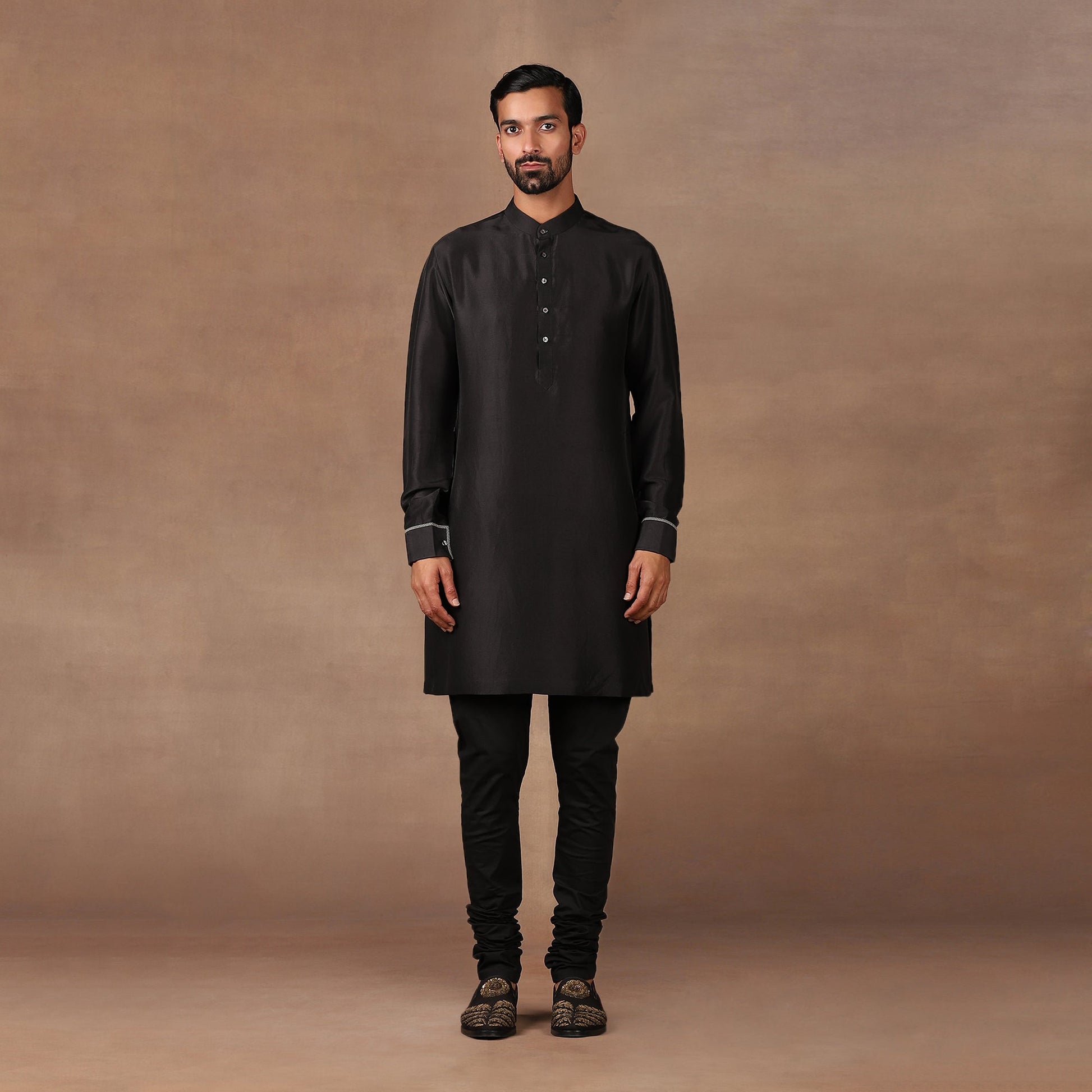 This Nehru jacket is crafted from a luxurious Banarasi woven fabric, intricately adorned with bugle bead and kasab resham embroidery. The antique silver finish enhances the opulence of this piece, making it a striking choice for a distinguished look. Paired with a coordinating kurta and churidar.