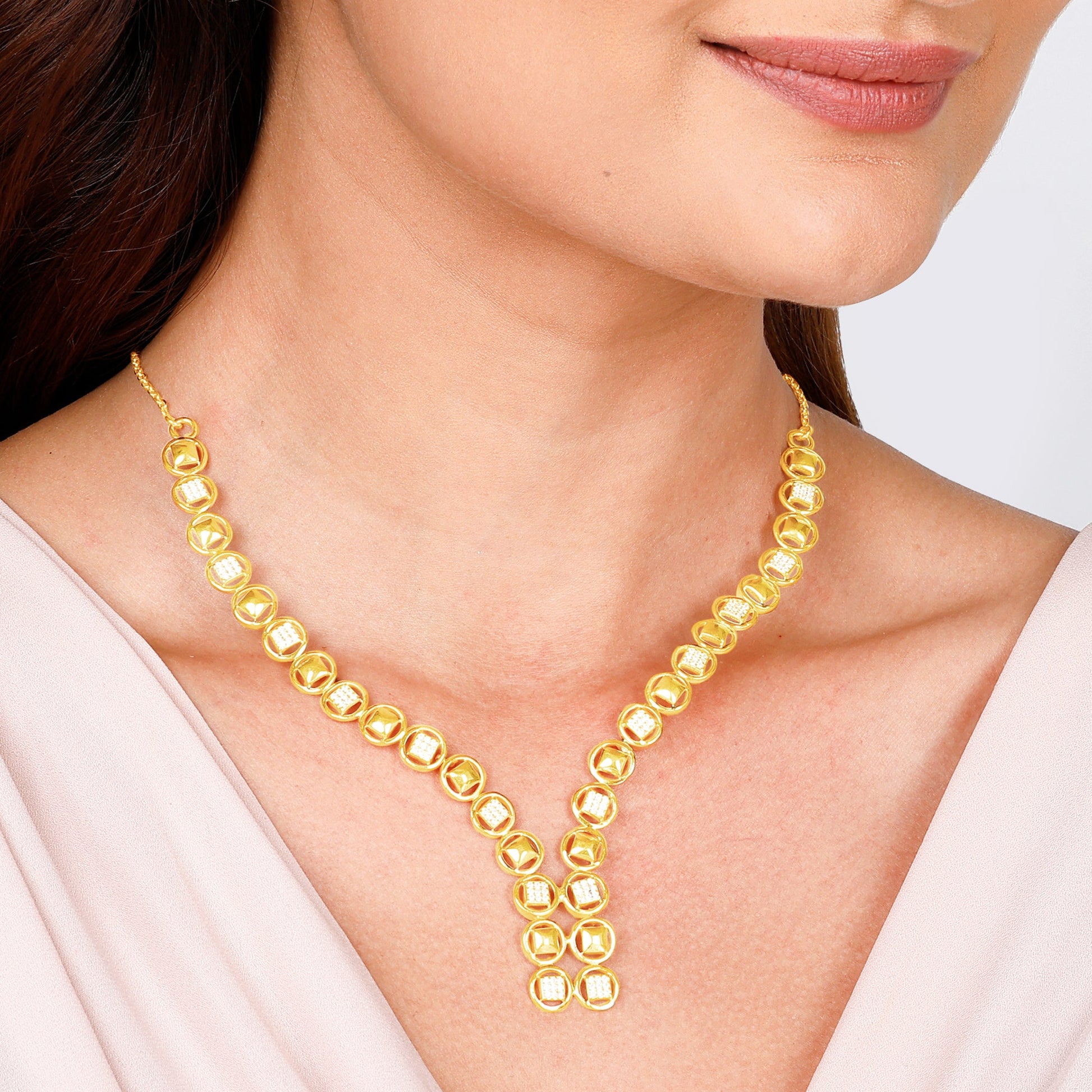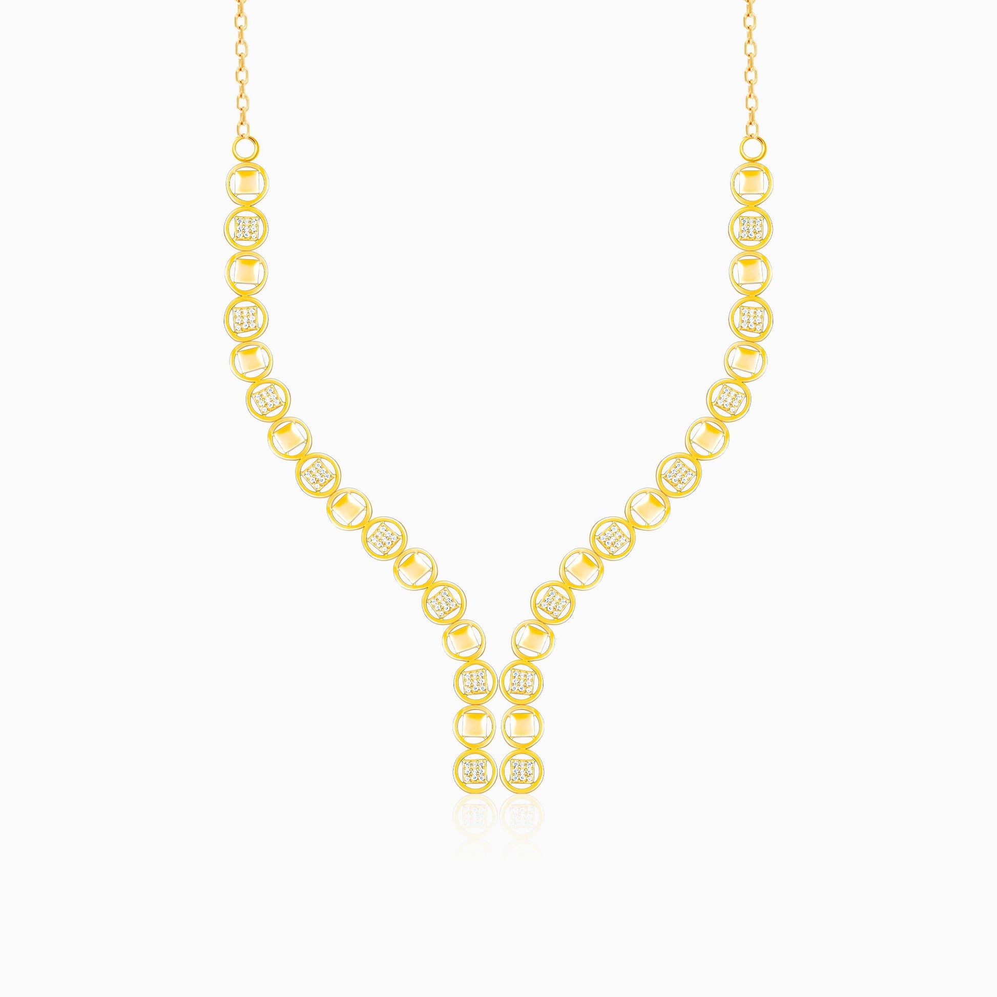 This golden necklace has a button design with an alternative circle studded with zircons.