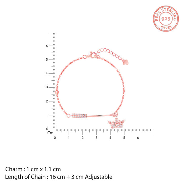 This rose gold bracelet for women features a horizontal bar element set with zircons, extending to a dangling crown charm also set with sparkling zircons. A small, round rose gold bead accentuates the chain.