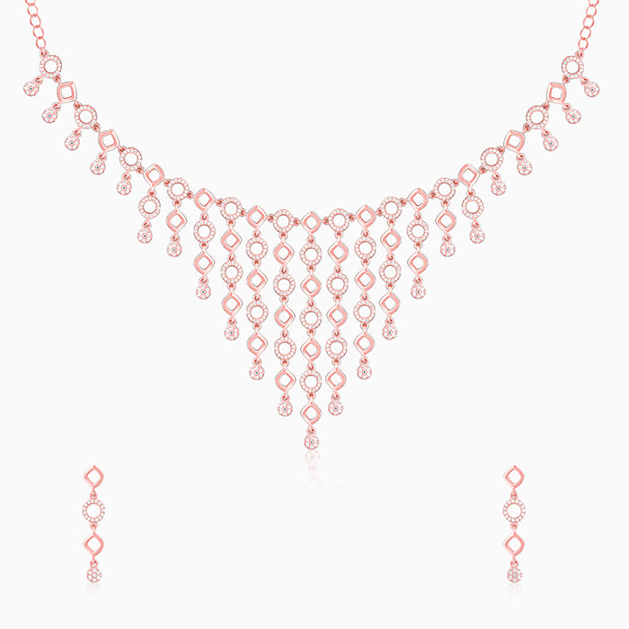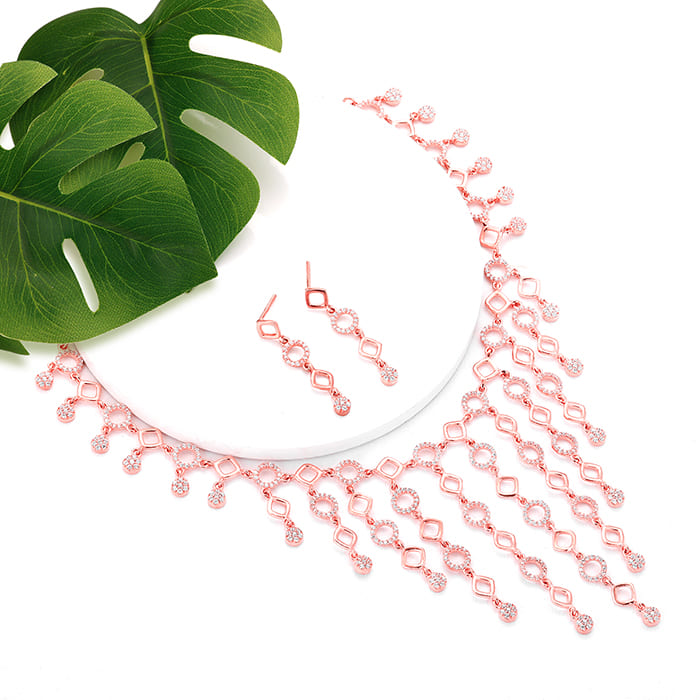 These rose gold earrings and necklace set has a gorgeous design with alternative circle and square motifs and circles studded with zircons and all motifs with small zircons hanging like mini chains at the bottom.