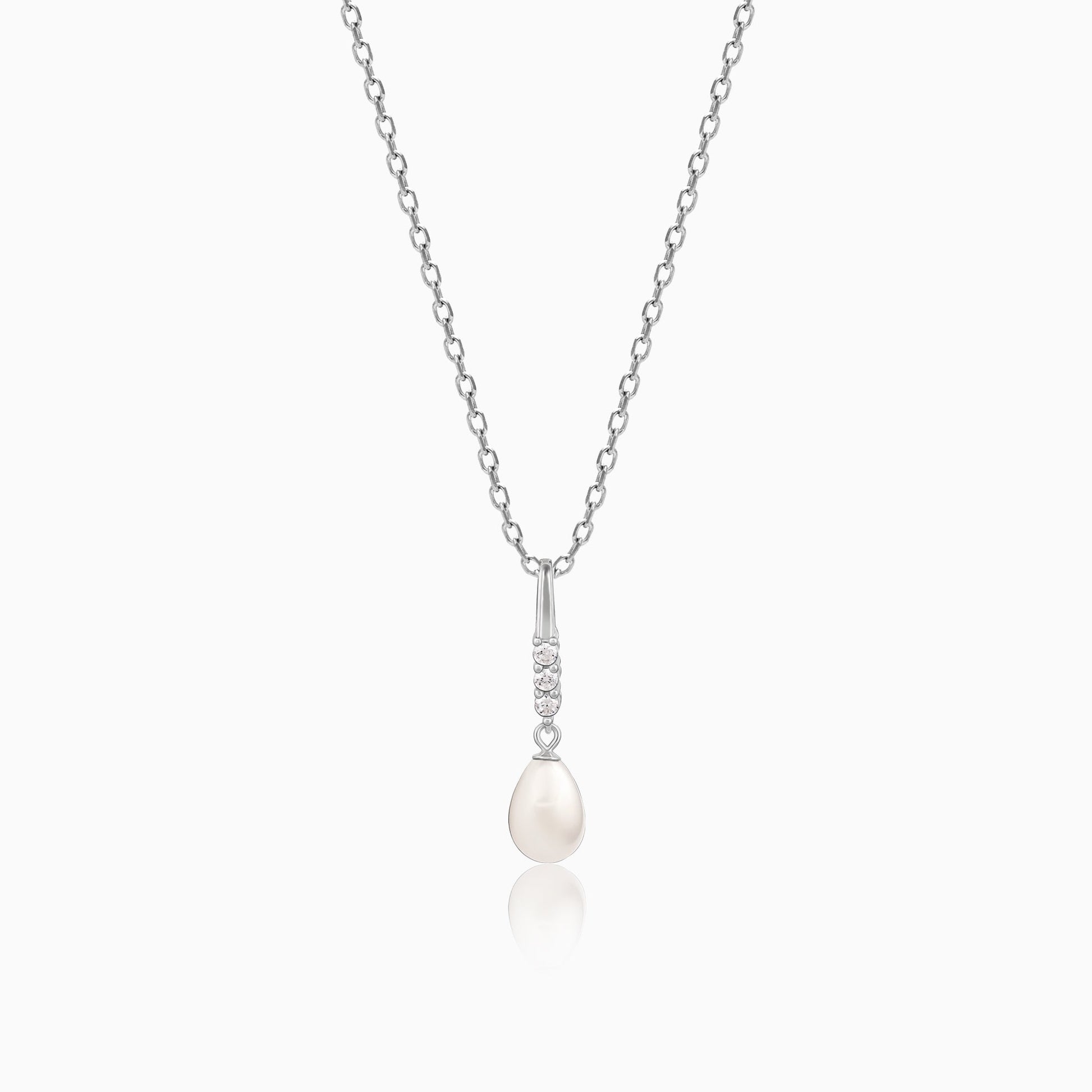 The Silver pendant has zircons arranged in a row and a pretty pearl dangling from them.