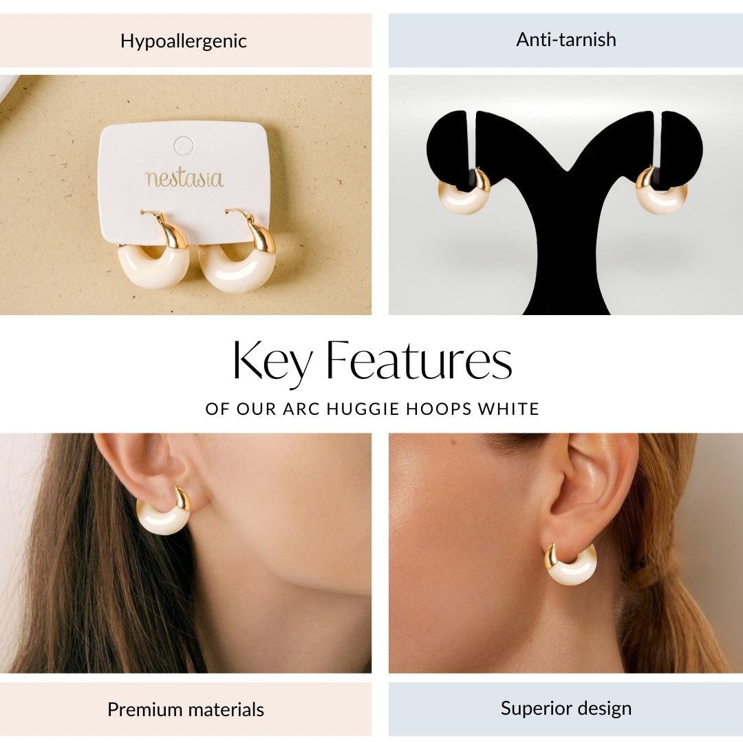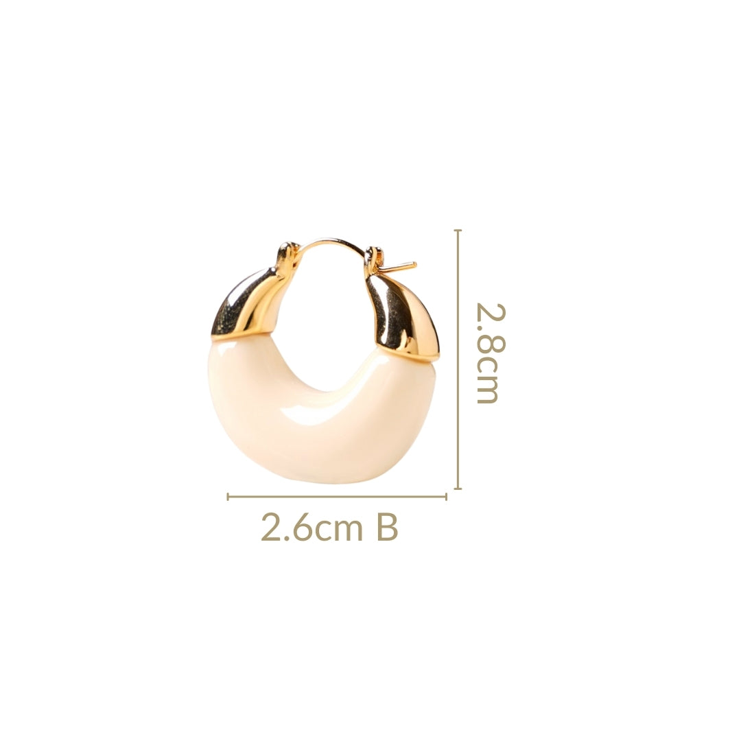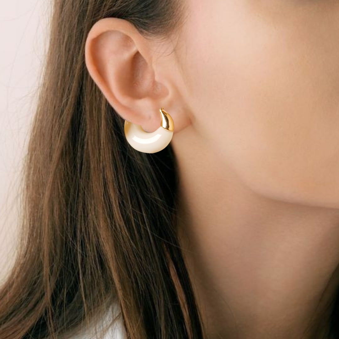 These huggies are designed to make a statement in the most understated way! The sleek, curved arc hugs your earlobe gently, creating a simple yet eye-catching silhouette. Featuring a polished gold clasp and a smooth resin body in classic white, these earrings have a clean, timeless look that pairs beautifully with any outfit. The crisp white finish adds a fresh and sophisticated touch, making them a go-to accessory for both everyday wear and special occasions.