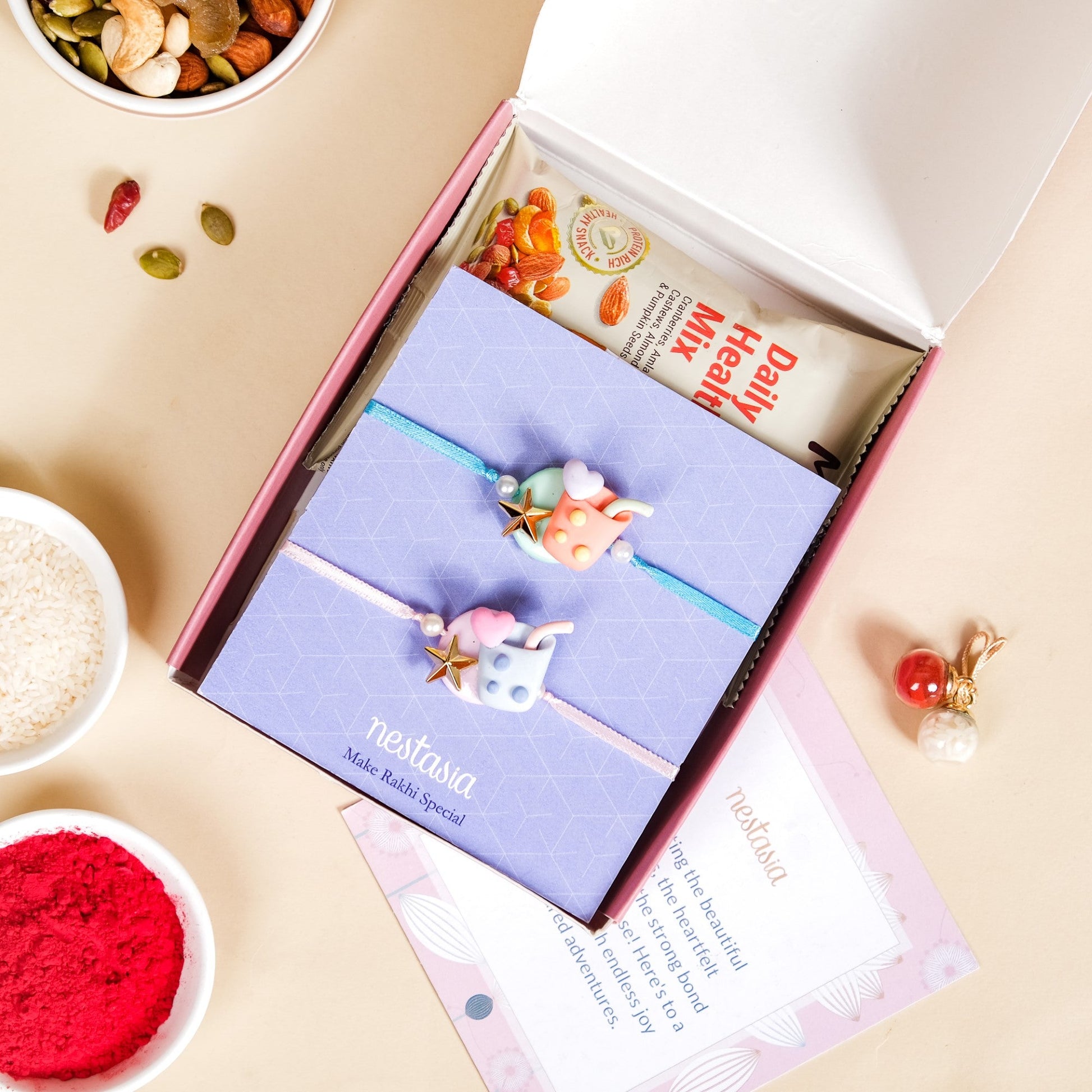 Blast off to a stellar Raksha Bandhan celebration with our out-of-this-world Rakhi hamper, perfect for your younger brother whose one true dream is to become an astronaut! This fun-filled gift hamper includes two vibrant Rakhi bands, a space-themed planner to capture all his cosmic dreams, and a traditional roli-chawal set. Treat his taste buds with a pack of delicious chocolates and a healthy mix of dry fruits. Everything comes packed in a charming gift box, ready to delight. Top it off with a heartfelt wish card to show your love and encouragement. Make his Rakhi special and spark his imagination for space adventures!