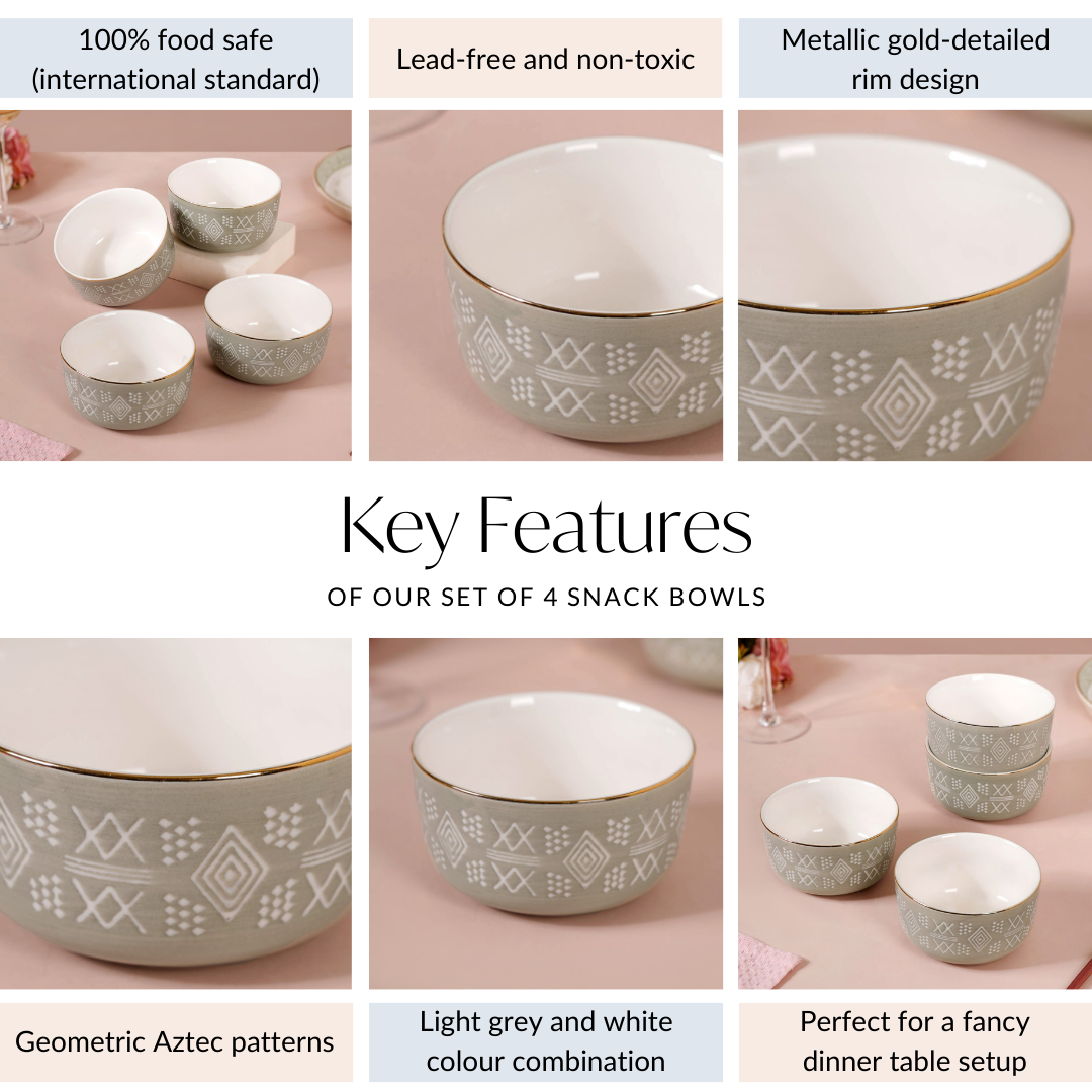 Experience the allure of fine dining with our Azo snack bowls, available in a set of 4. Made from 100% food-safe ceramic to international standards, these lead-free, non-toxic side bowls prioritise your health and safety. Adorned with chic metallic gold-detailed rims and intricate Aztec patterns in a sophisticated light grey and white palette, they add a touch of elegance to any table setting. Ideal for hosting fancy dinners or casual gatherings, this set of 4 snack soup bowls is a must-have for those who appreciate both quality and aesthetics. Make every meal a statement with the Azo Collection!