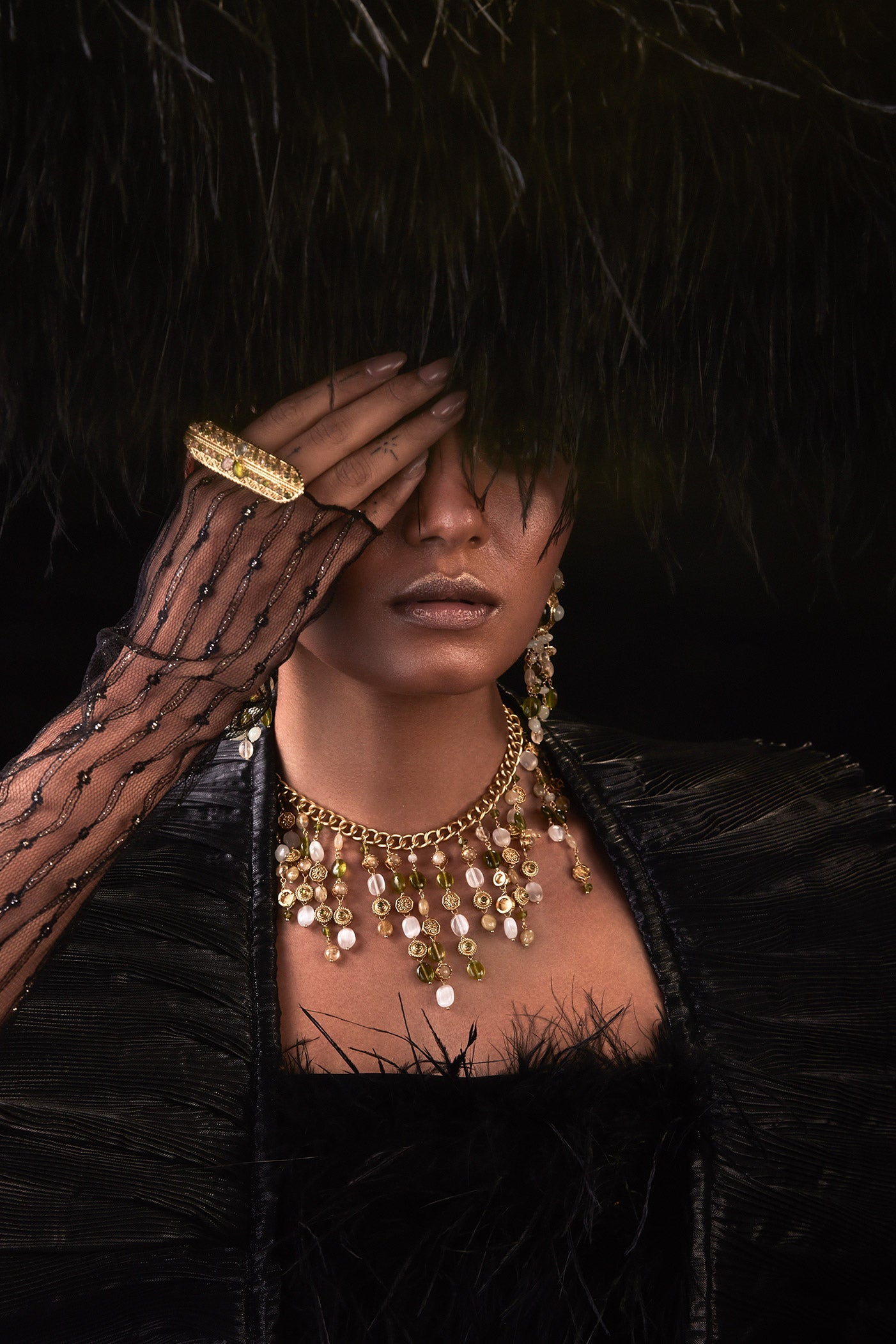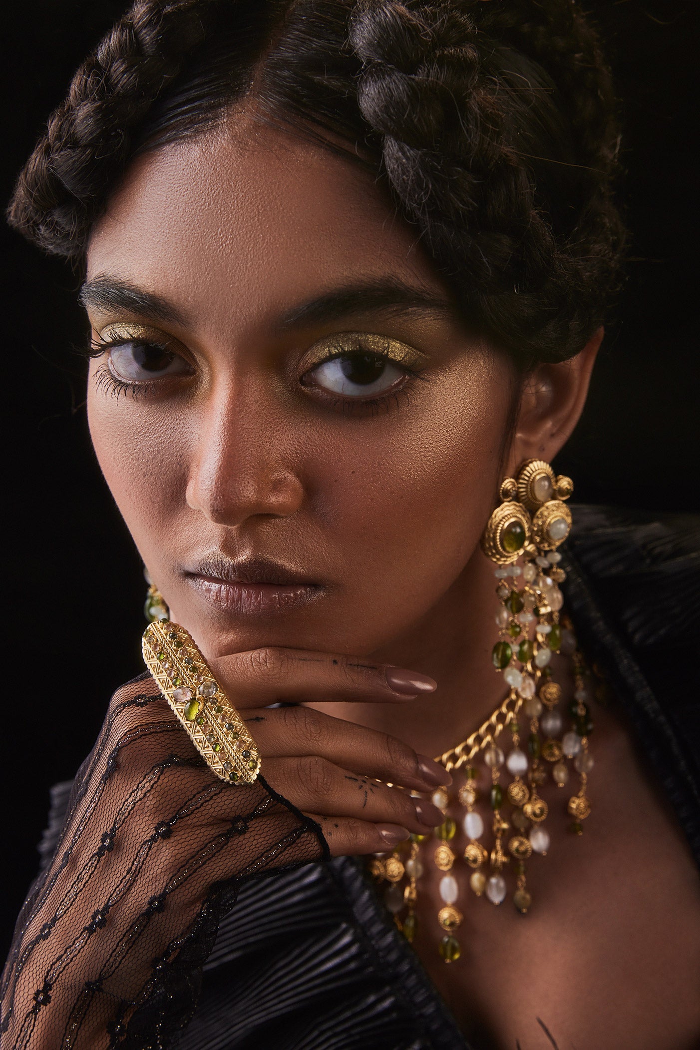 This classic double-motif ring brings forth a vintage design aesthetic to life with decadent green jade, green rutile, and sun stones set on a richly-carved, angular golden base.