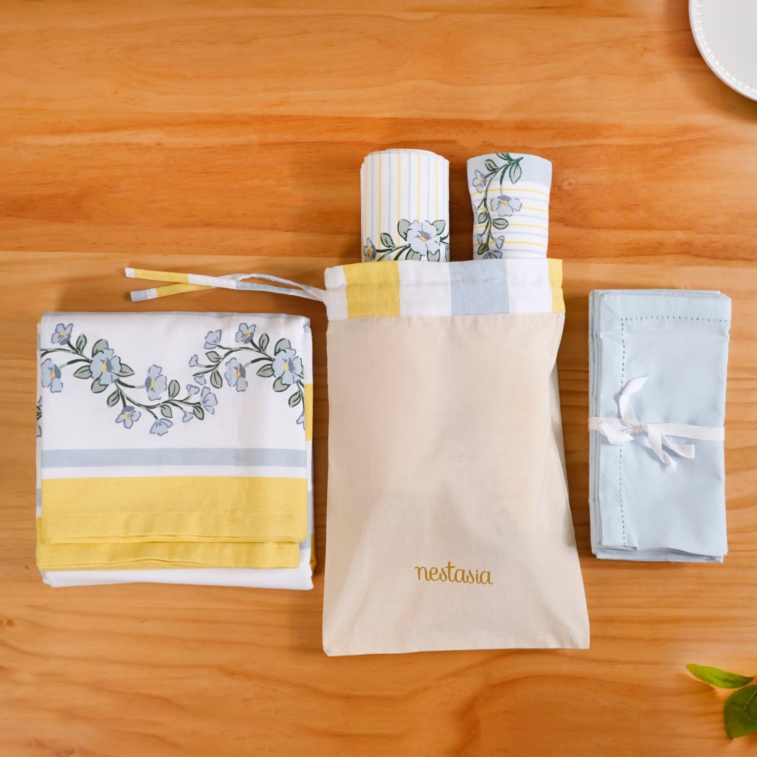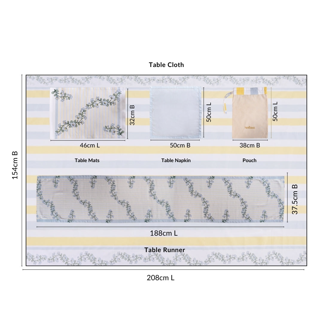 Design: Transform every meal into a refined dining experience with the Azzurro Chic Table Linen Family Set. The linen table cloth features a crisp white base adorned with soft blue and yellow stripes, beautifully accented by delicate blue florals and lush green stems with deep green highlights. The matching table runner extends this aesthetic, tying the look together with effortless sophistication. The table cover, placemats, and napkins complete the ensemble, balancing vibrance with understated charm. Designed for both everyday use and special gatherings, this set brings a fresh, inviting touch to any table setting.
