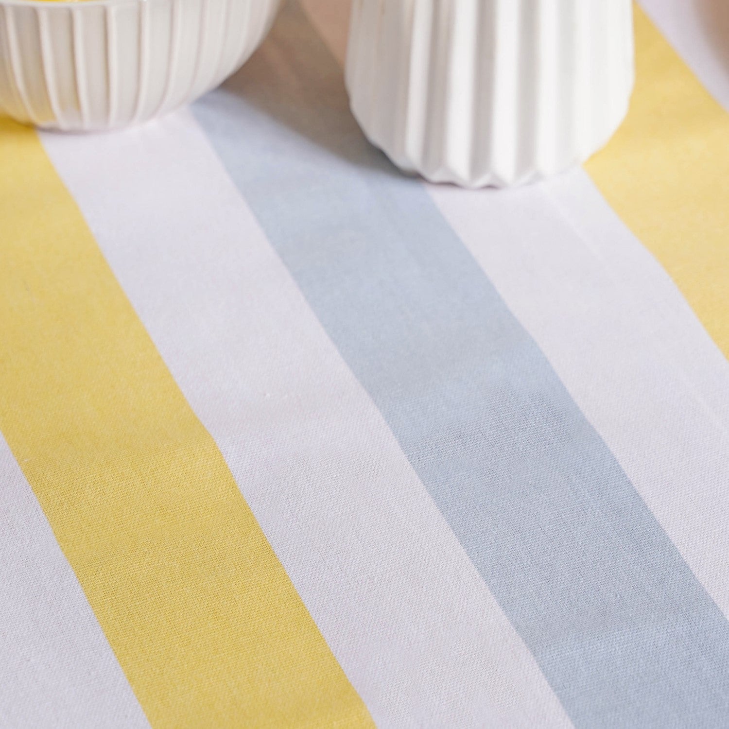 Design: Woven from premium-quality cotton, the Azzurro tablecloth features a crisp white base adorned with delicate blue florals and leafy green stems, framed by vibrant yellow and deep green stripes. The intricate detailing strikes the perfect balance between sophistication and freshness, while the soft yet durable fabric drapes gracefully across the table. Whether paired with a coordinated runner or styled with solid-coloured napkins, it creates a cohesive and inviting dining atmosphere.