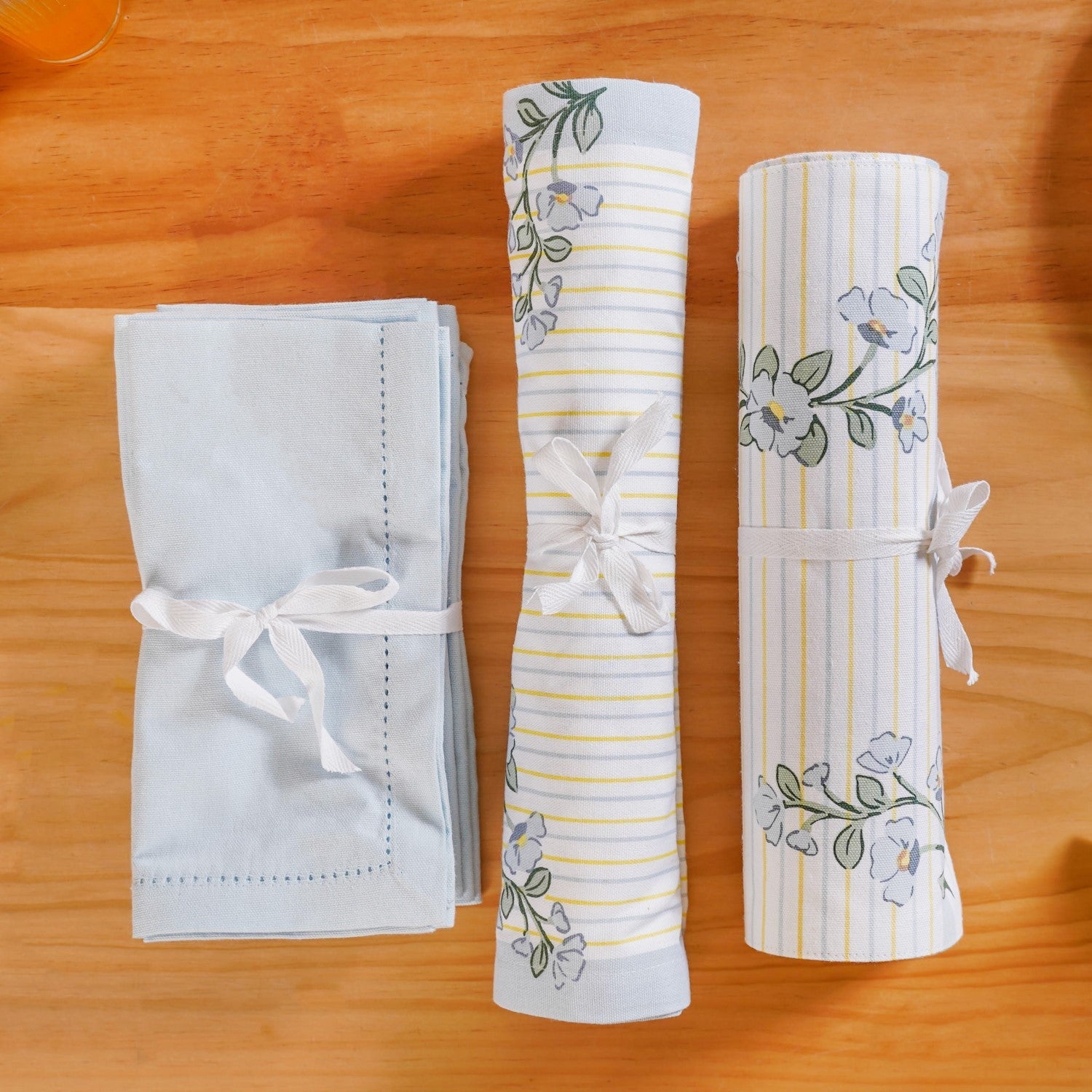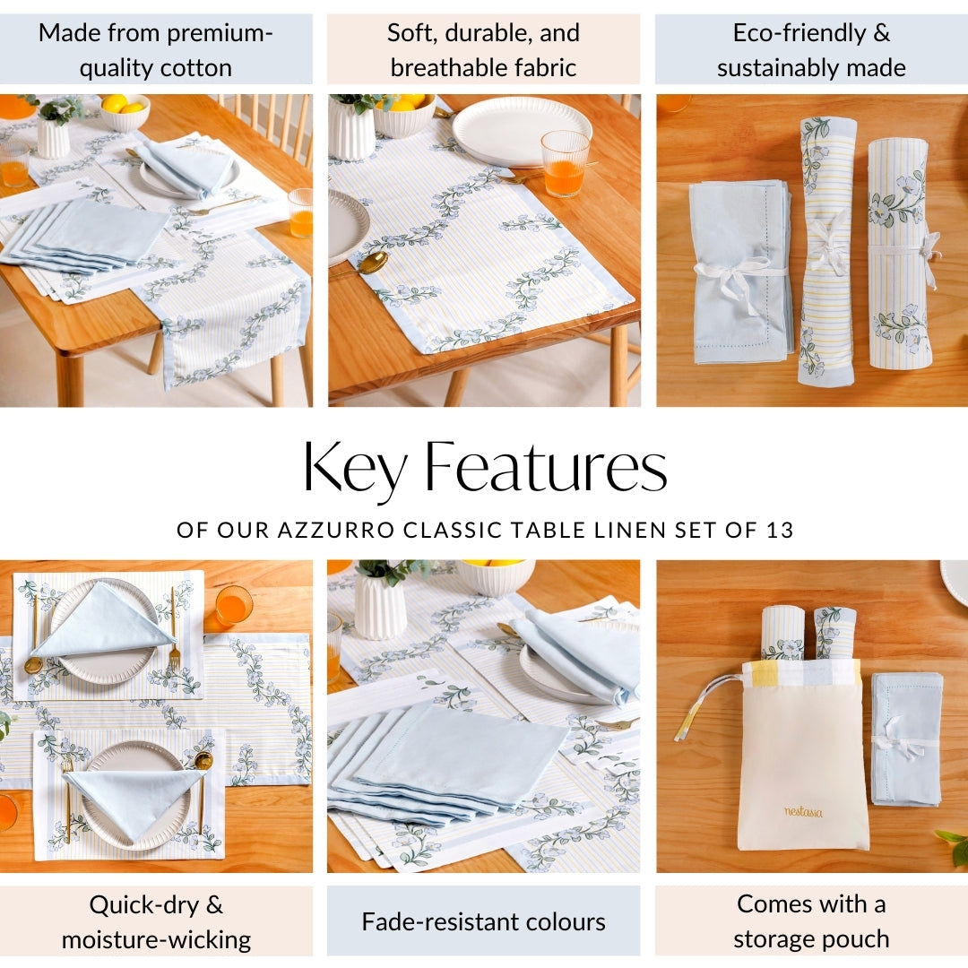 With the Azzurro Classic Table Linen Set, your dining space gets an instant glow-up. The soft white backdrop, adorned with charming blue flowers and subtle green stems, brings a refreshing yet timeless aesthetic to every meal. Whether it’s a cosy brunch or an elegant dinner, this linen table cloth set ensures your table is always dressed to impress.