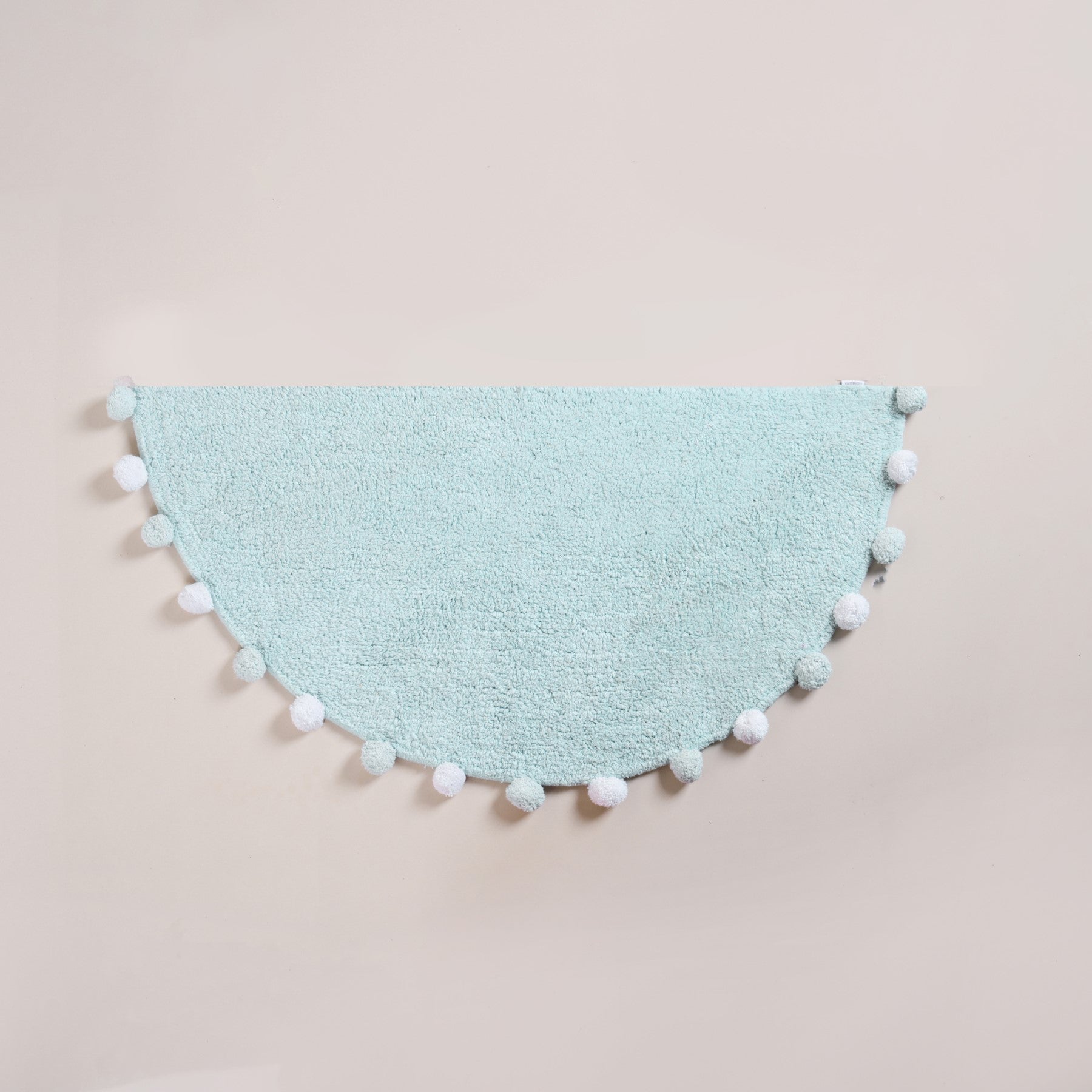 Design: Brighten up any corner with this breezy blue floor mat that brings comfort, charm, and calm in one sweep. Designed for both little ones and grown-up spaces, the half-moon silhouette adds a modern twist, while the plush feel makes it perfect for morning stretches or bedtime snuggles. Soft yet durable, this mat fits beautifully in bedrooms, play zones, or reading corners. The row of crisp white pom-poms around the edge lends a playful finish, making it a delightful accent piece that’s more than just a mat; it’s a mood.