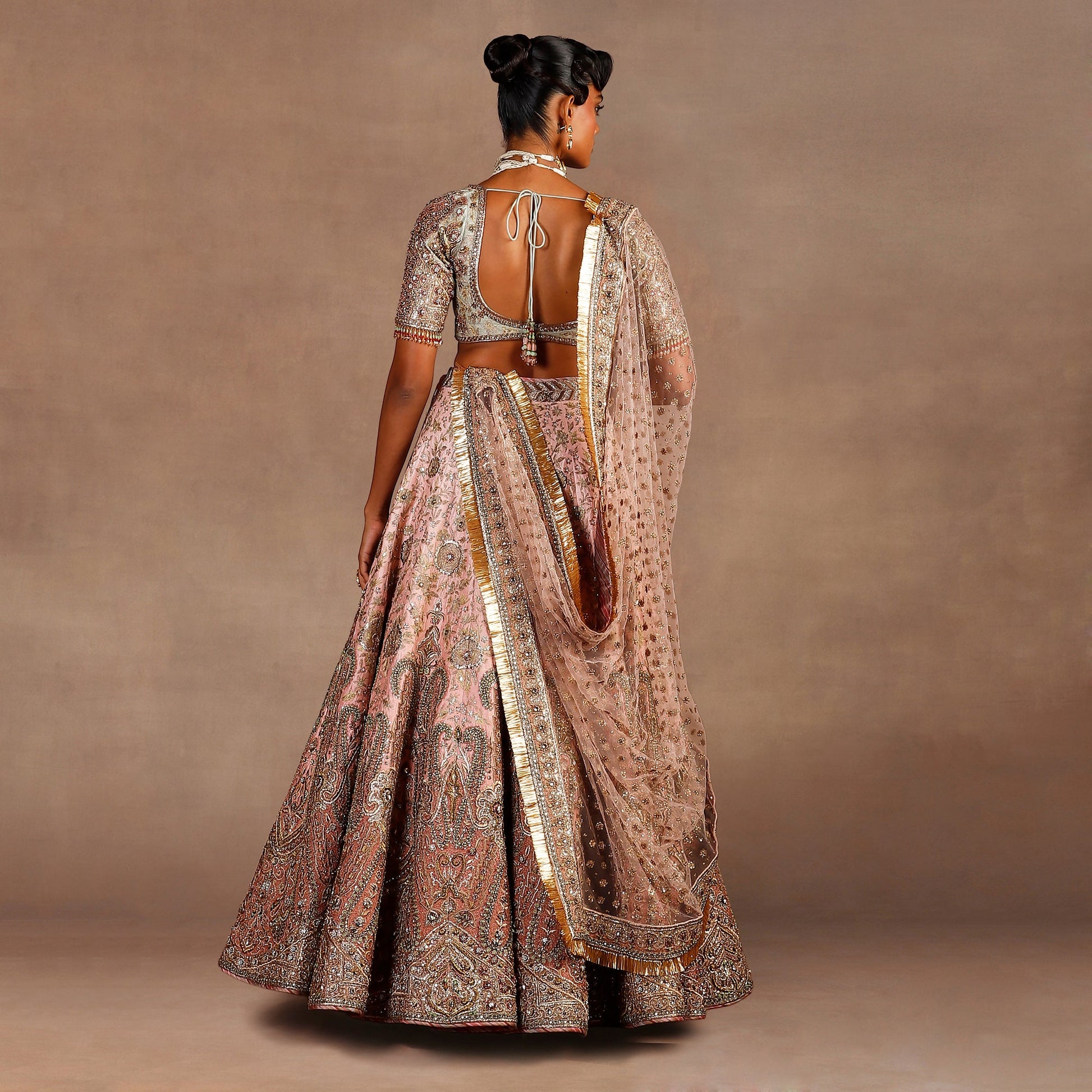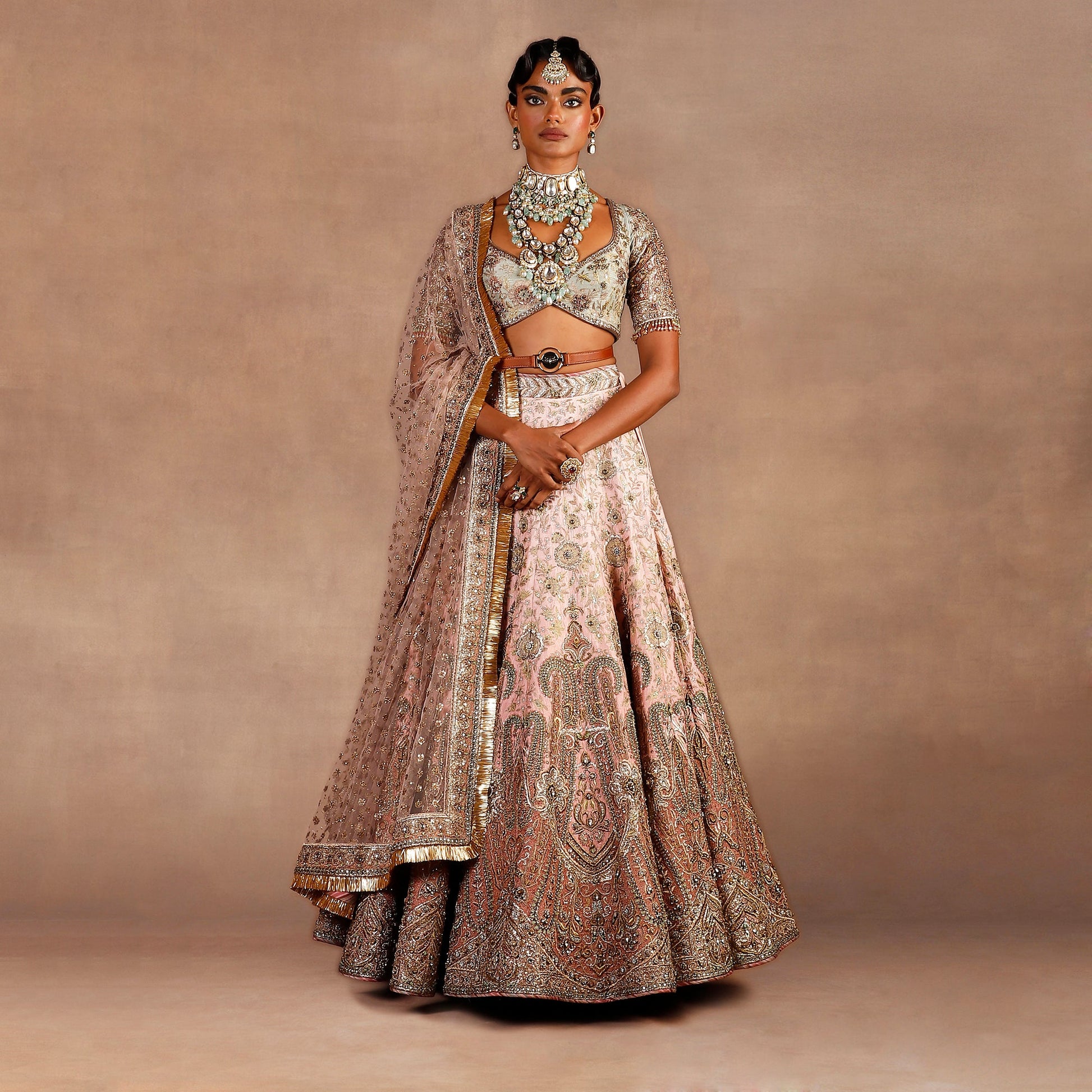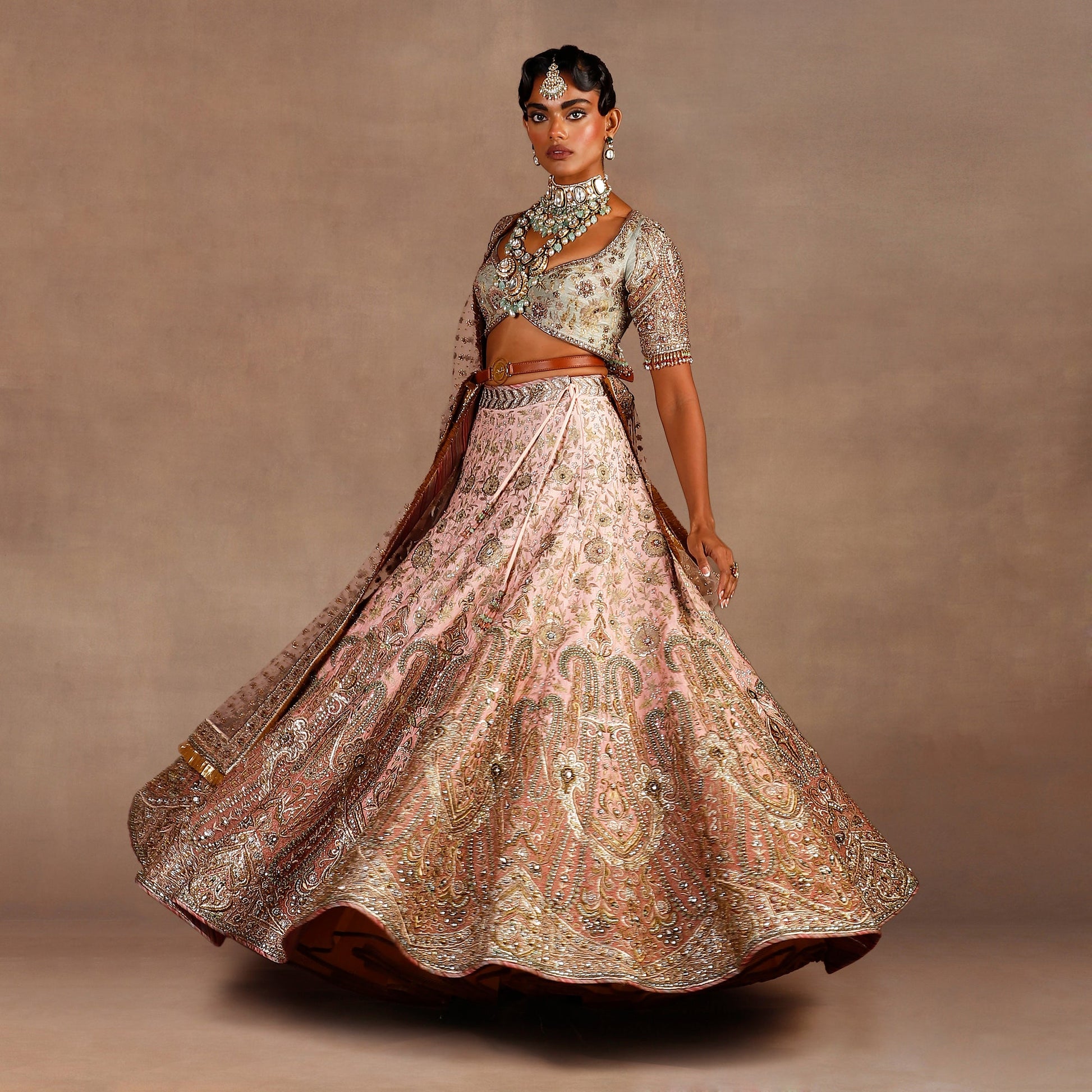 Crafted with meticulous artistry, this lehenga set showcases an ombre transition in baby pink, enriched with intricate antique gold metallic embroidery, resham threadwork, sequins, crystals, kundans, and zari. The sage green blouse features tassel edging along the sleeves, adding a distinctive accent. A complementing embroidered tulle stole with kiran edging completes the ensemble, offering an elegant statement for special occasions.