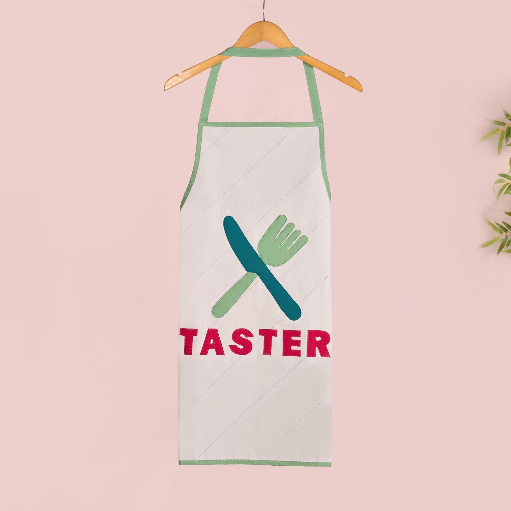 Design: The "Baker & Taster" apron set is designed for couples who love sharing the kitchen - one whipping up treats and the other sneaking a taste. Made to add charm and laughter to your culinary moments, this apron set combines functionality with fun design. The quirky design features playful appliqués, a chef's hat for the “Baker”, and a fork-and-knife cross for the “Taster.” Both designs are highlighted in vibrant green and teal, contrasted with bold magenta lettering. Finished with soft green borders and ties, the aprons add a stylish, fun flair to your cooking sessions.