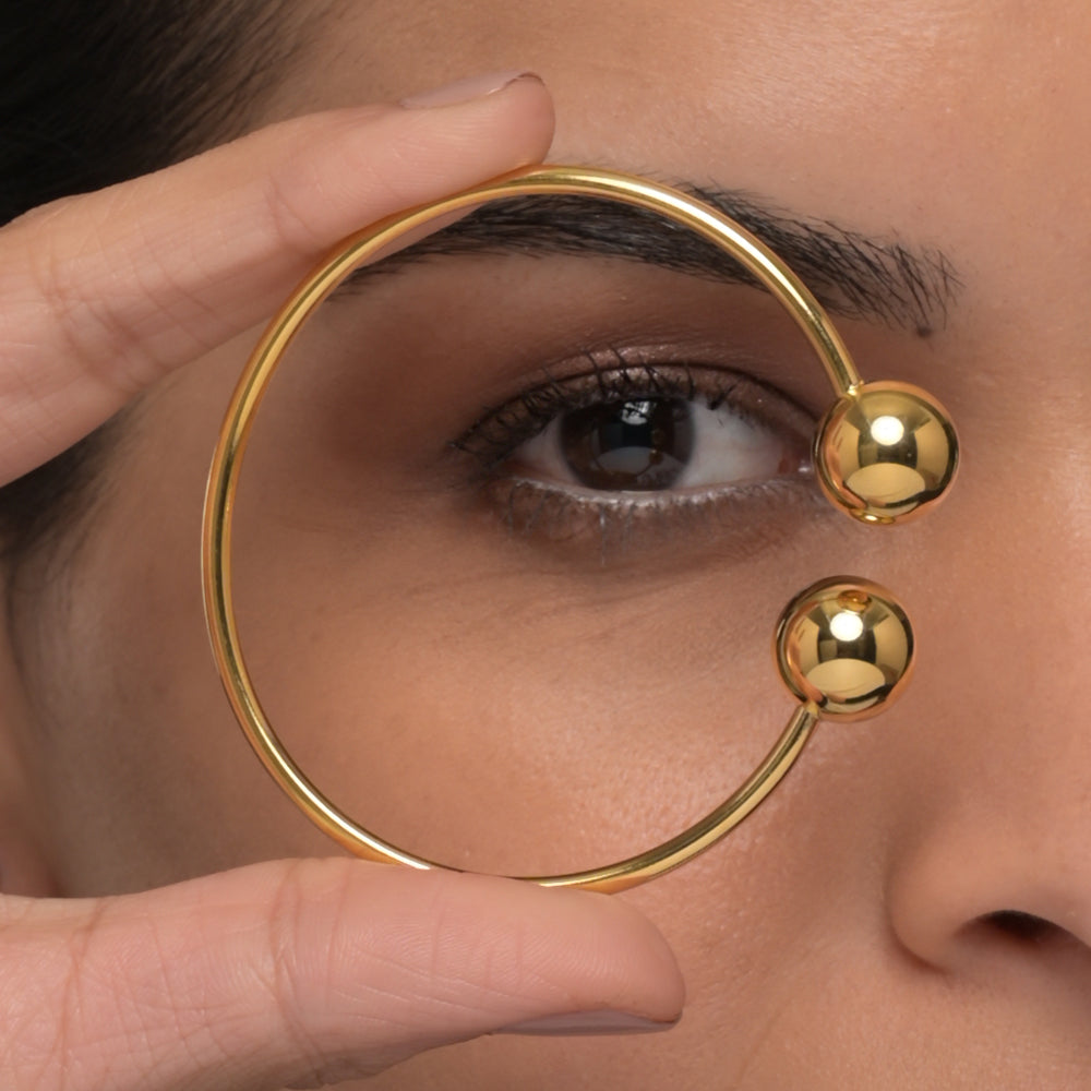 A sleek open bangle crafted with polished golden spheres on each end, blending minimal elegance with modern edge. Lightweight and durable, its open cuff design ensures comfort and effortless wearability. With its refined simplicity, this bracelet is a versatile piece that complements both casual and formal looks.