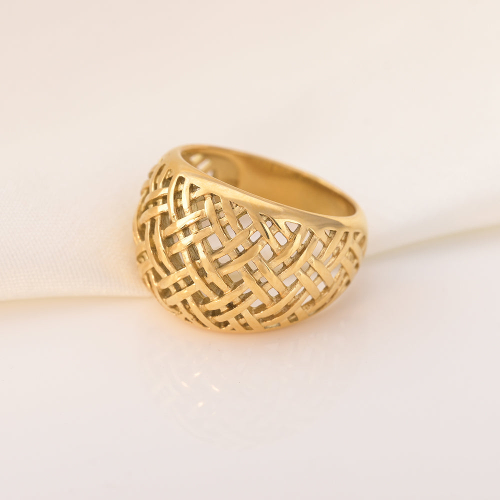 The Bamboo Wave Ring draws inspiration from the gentle rhythm of bamboo swaying in the breeze. Its intricate design encapsulates the beauty of nature in a refined and wearable form. With its lustrous gold finish, this ring epitomizes luxury and timeless appeal. The bamboo wave design adds texture and movement, elevating your style with a touch of artistry.