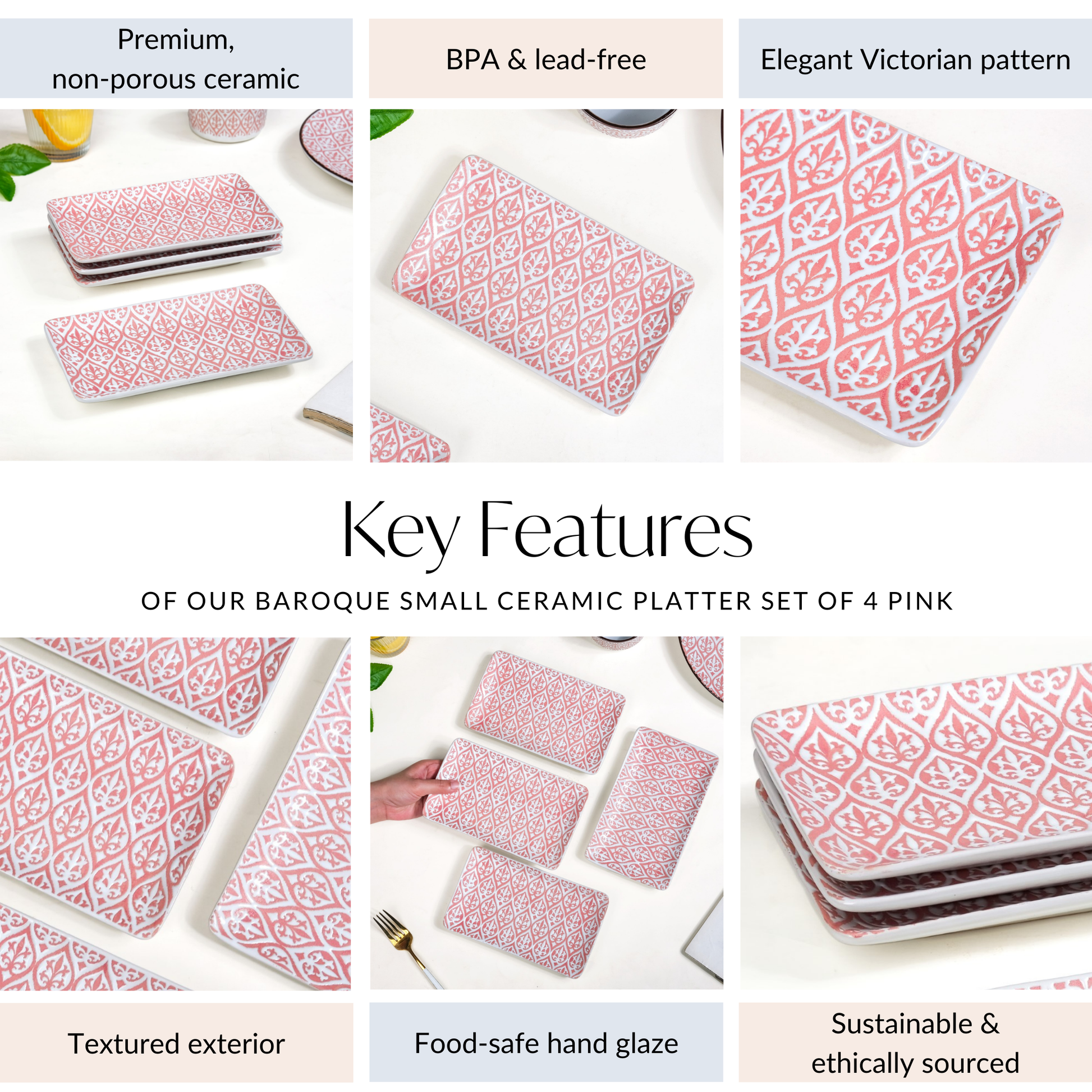 Design: Adorned with a timeless Victorian baroque pattern in a delicately feminine pink and white colour combination, this ceramic platter set blends modern sophistication and vintage charm. The sleek rectangular shape makes the serving platters easy to handle. As a result, this ceramic platter set is as stylish as it is practical.