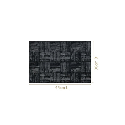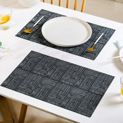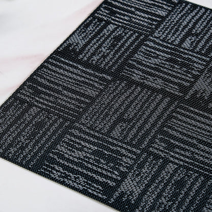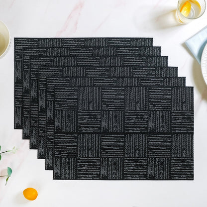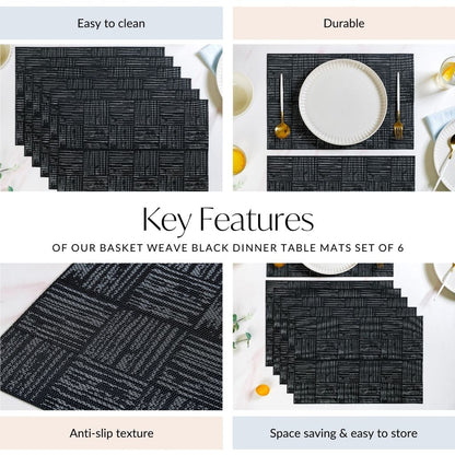 Design: Featuring a basket weave-inspired design, this set of black table mats combines modern geometric patterns with a sophisticated black tone, bringing a touch of elegance to your dining setup. Crafted from durable PVC, these placemats are built to withstand everyday use, making them both functional and stylish. The textured surface prevents slipping, ensuring that your plates and cutlery stay securely in place. With a contemporary design, these mats offer versatility, allowing you to switch up your style with ease while saving space and simplifying storage.