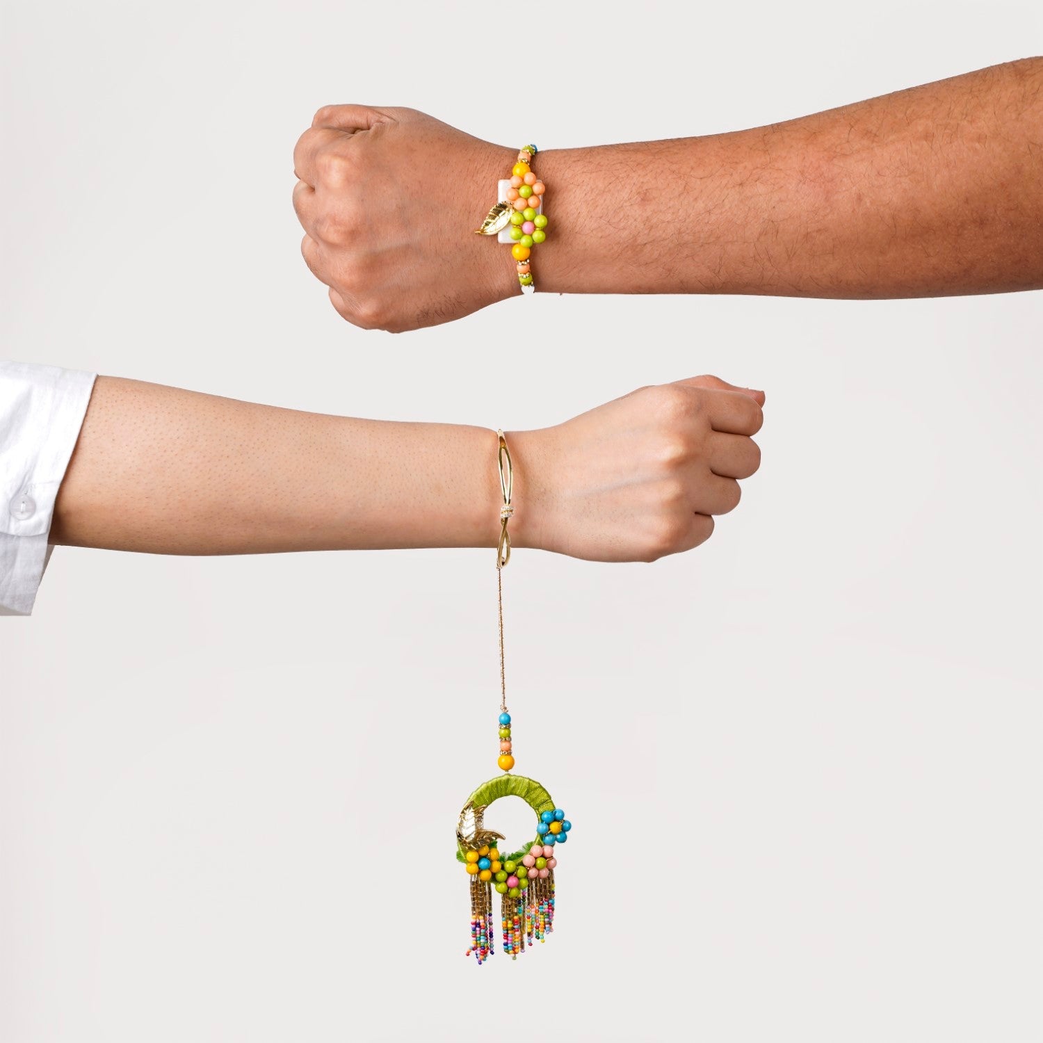 A burst of festive joy, this Rakhi set features vibrant beads in pops of orange, lime green, blue, and pastel pink. The lumba is styled on a circular base wrapped in bright green thread, accented with golden leaves and multi coloured tassels for a playful finish. The set includes 1 rakhi band & 1 lumba, 1 roli chawal bottle set, 1 pack of mixed dry fruits (free gift), 1 gift box, and 1 wish card.