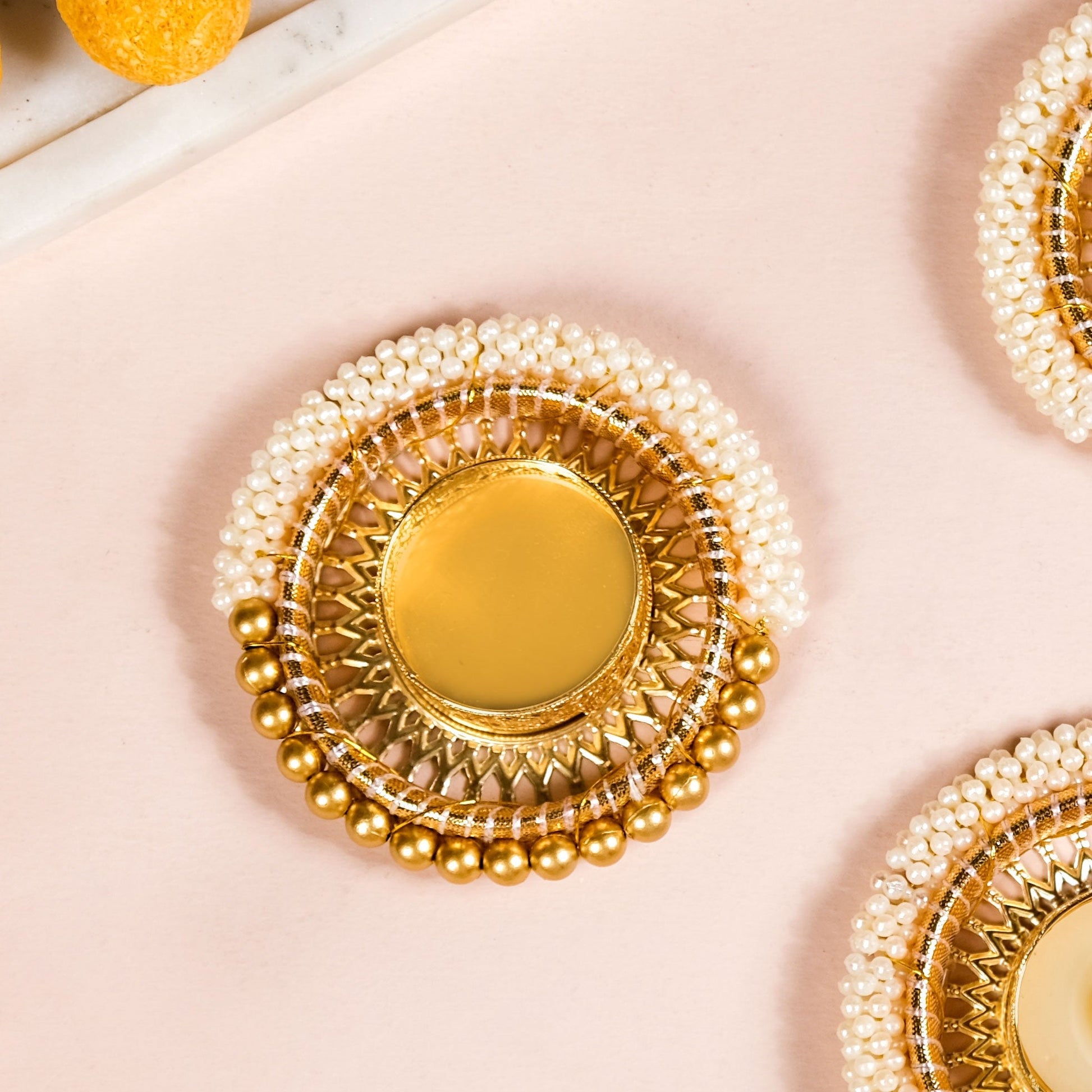 Design: This elegant set of six tealight holders features a round metallic gold base surrounded by detailed craftsmanship. Each piece is divided into two halves by design. One half is embellished with medium-sized radiant golden beads, whereas the other half of the circle is adorned with a cluster of tiny white beads to imitate pearls. The warm gold tone and delicate contrast of beads make it a perfect fusion of festive opulence and tradition.