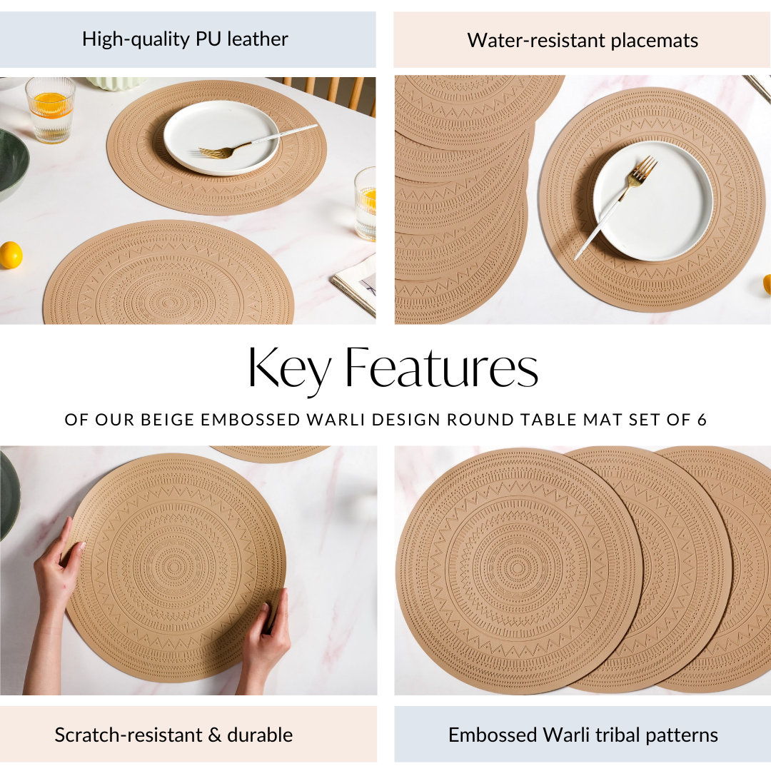 Design: These round table mat pieces are a stunning fusion of art and minimalism. Adorned with a unique Warli tribal-inspired embossed pattern, each dining table placemat breathes life into your place setting. With its smooth, round design and subtle detailing, this table mat set exudes contemporary charm while honouring timeless traditions. The anti-skid, rubber backing not only keeps your placemat securely in place but also ensures that these dining table mats offer a flawless blend of style and practicality for every meal.