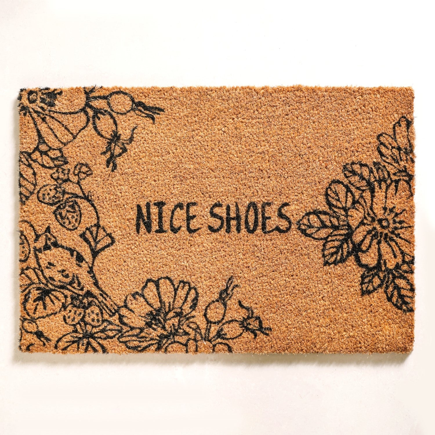 Design: The floor mat boasts a coir fibre surface adorned with elegant black leaves and floral designs. A touch of playfulness is added with the text "nice shoes" printed in bold black, creating a welcoming vibe. The neutral beige backdrop complements various decor styles, making it versatile for modern or classic entrances.
