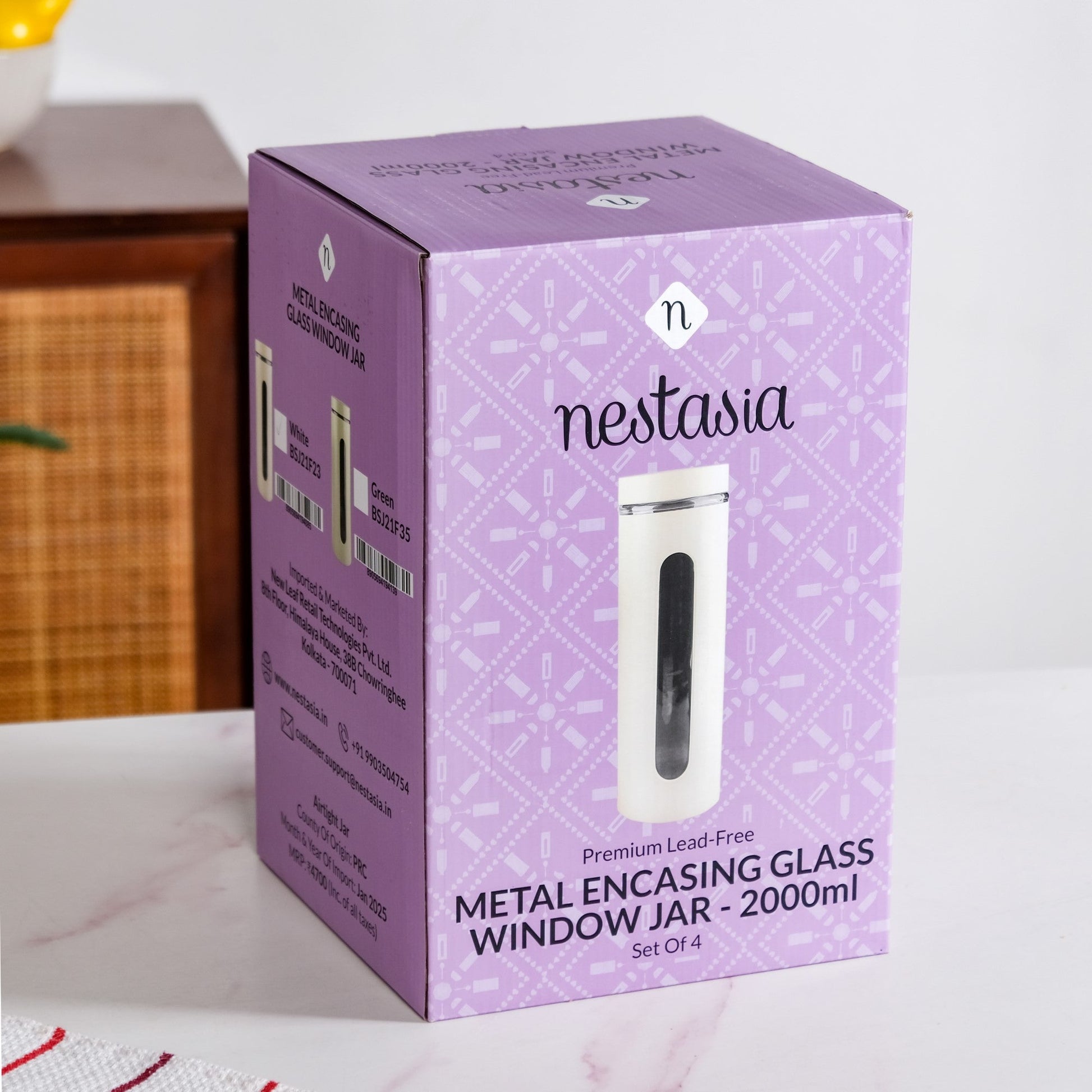 Bring style and order to your kitchen shelves with this glass storage jar, elegantly wrapped in a sleek metal casing. The jars come in a beautifully designed gift box.