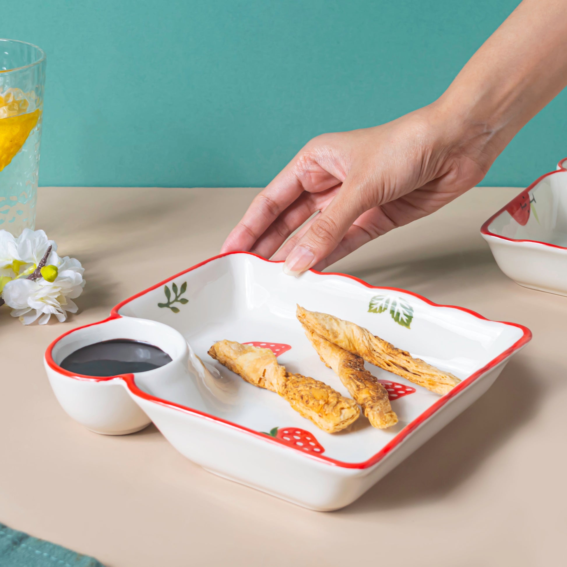 The strawberry-printed sectioned snack dish is excellent for weekend brunches and evening get-togethers. The square red-rimmed plate is an unequaled souvenir platter as well as a beautiful table accent. The ceramic sectioned plate is an outstanding product for a modern kitchen. The strawberry plate is great for both munching and exhibiting delicacies because of its vivid red and white tints. Dim sums, momos, kebabs, skewers, grills and sausages, and other sizzling appetizers, as well as tantalizing dips, are easier to put on the sectioned plate.