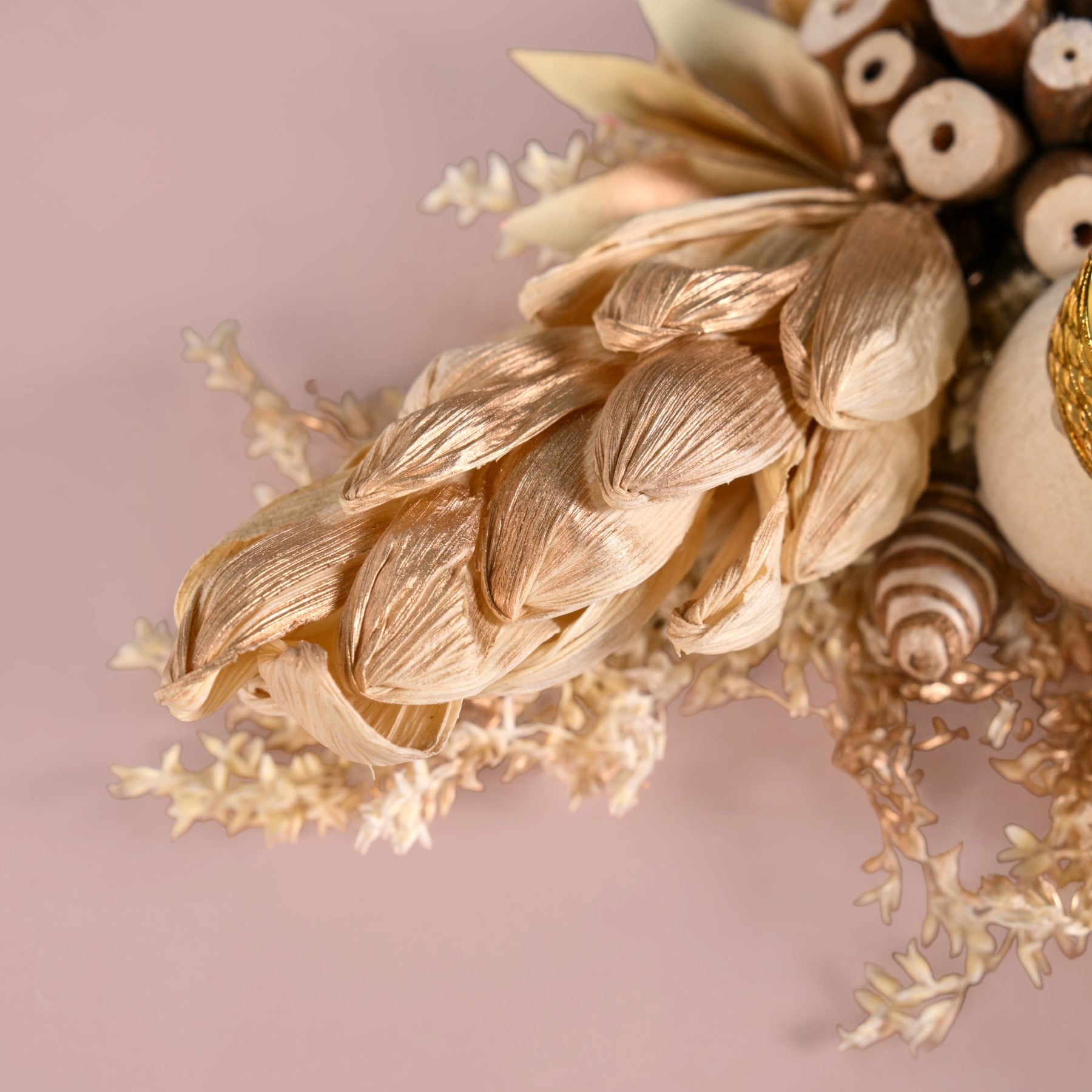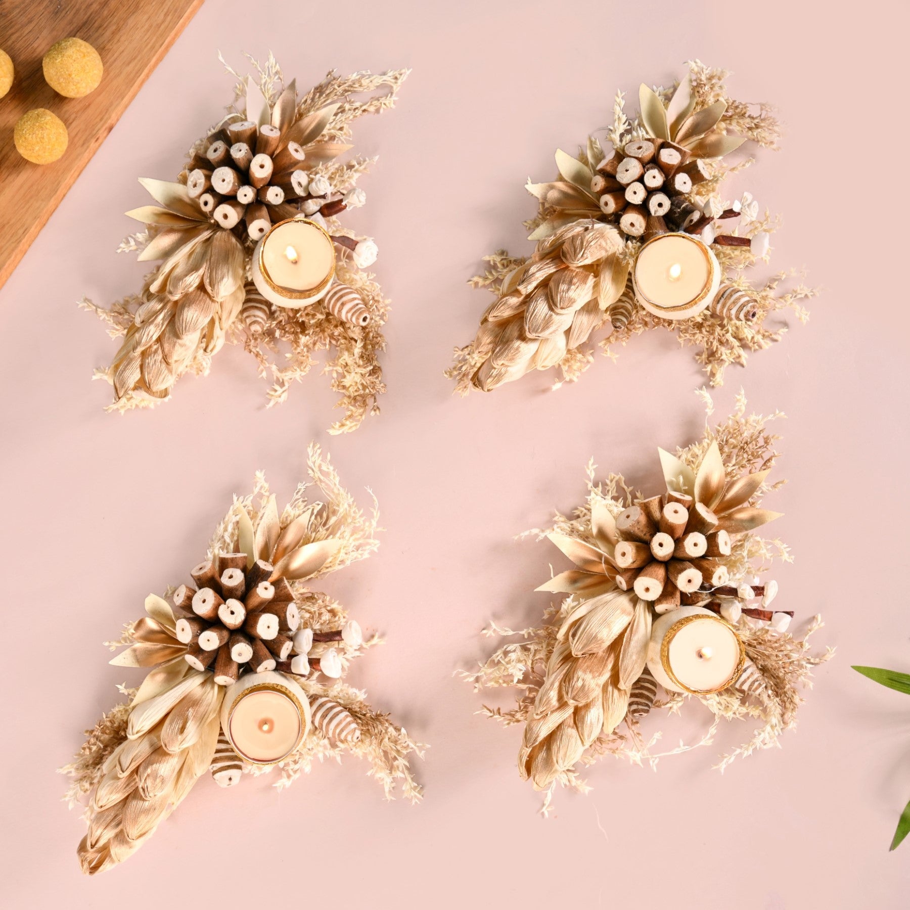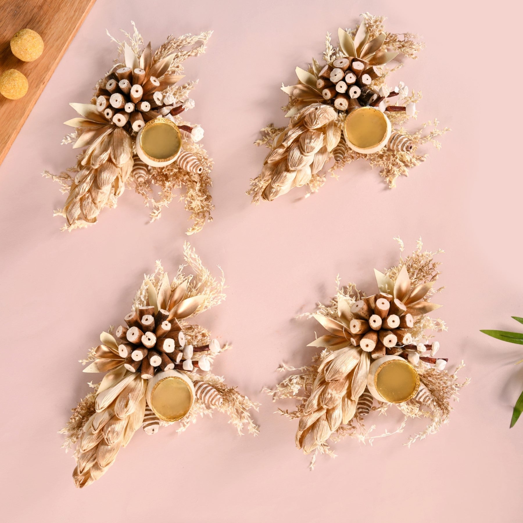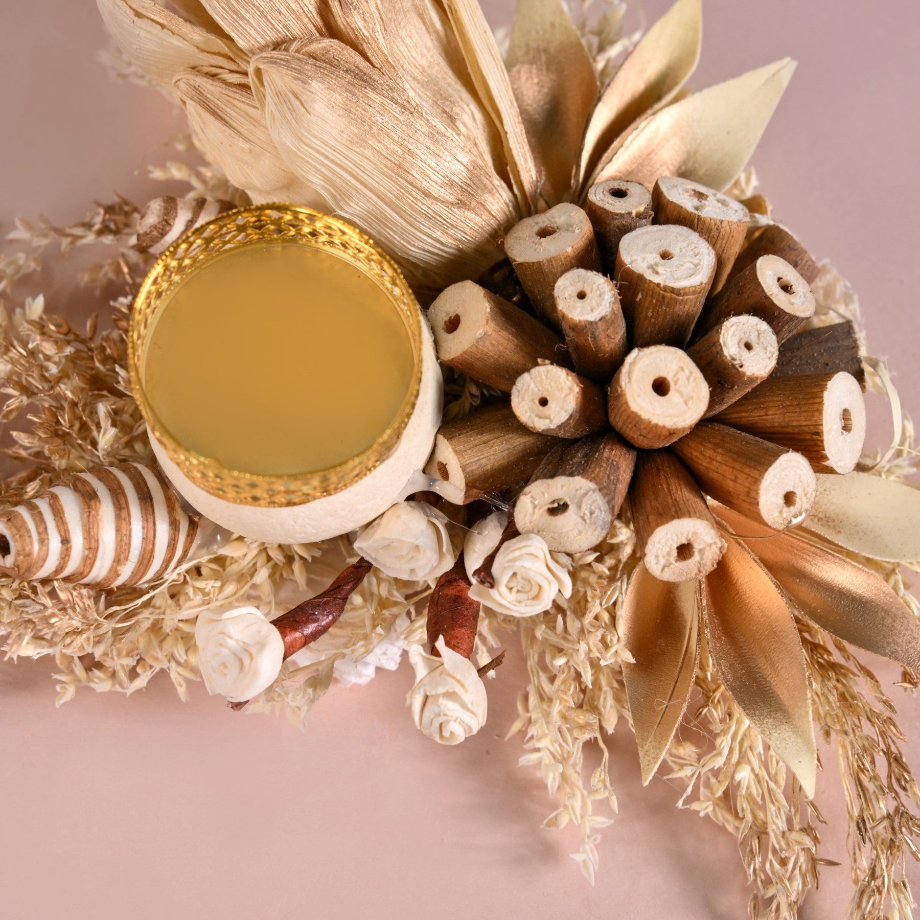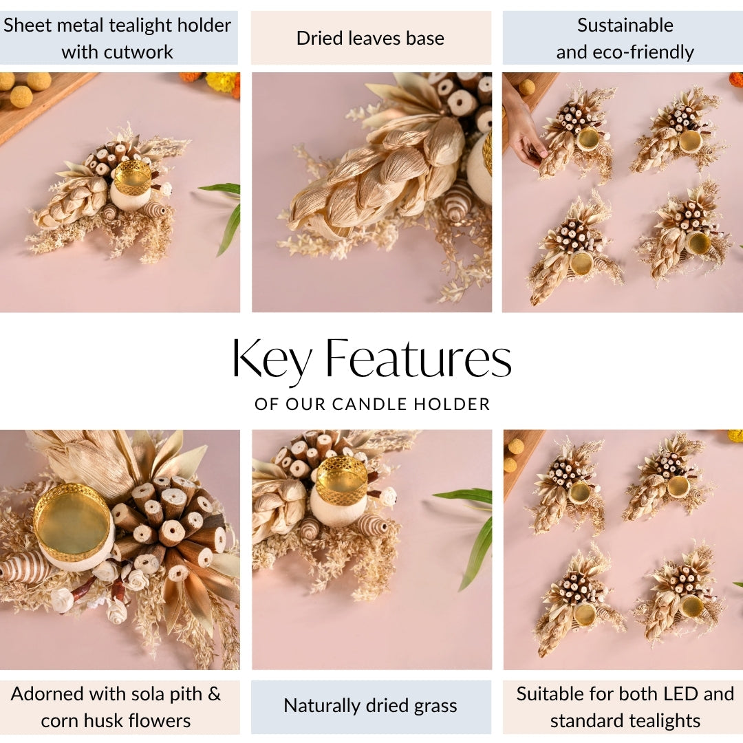 Design: This visually captivating candle holder set presents a harmonious blend of textures and natural elements. At its heart, an elongated petal cluster crafted from corn husk descends gracefully, its layered petals shimmering with a delicate, golden-beige hue. Nestled above, a cluster of charming, small, sola flowers with their pristine white centres adds a touch of delicate contrast. These natural blooms are elegantly arranged amidst a bed of naturally dried leaves and wispy dried grasses, forming a rustic yet refined foundation. Completing this unique arrangement is a delicate, ornate gold-colored sheet metal tealight holder, featuring intricate cutwork that is gracefully integrated, poised to cast a warm glow.
