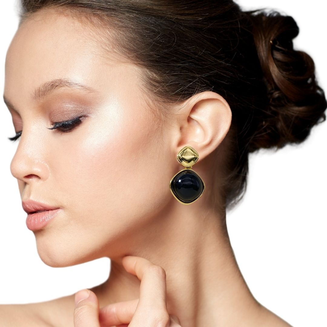 Make a striking statement with these drop earrings, where a geometric gold rhombus meets a bold black resin drop, framed in gold. These earrings are the perfect blend of contemporary edge and refined elegance. The drop earrings are ideal for adding a touch of modern sophistication to any outfit.
