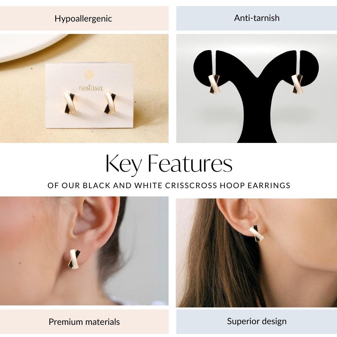 Amp up your style with our small gold-toned metal hoop earrings! These little beauties feature a cool abstract design, with a black and white band crisscrossing in an eye-catching way. Inspired by the way light and shadow dance in modern art, they bring a playful twist to any outfit. Whether you're hitting the town or just want to jazz up your everyday look, these hoops are the perfect pick! Easy to wear and full of personality, they’re sure to make you feel fabulous. Grab a pair and show off your unique vibe!