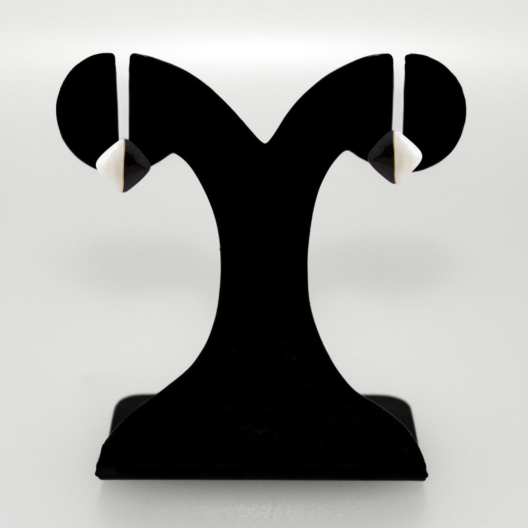 Meet your new favourite statement piece - our fabulous square stud earrings! These stunning earrings feature a bold black base stylishly sliced by a chic gold diagonal line, creating two striking triangles -one sleek black and the other fresh white. Inspired by the playful dance of light and dark, they're all about finding that perfect balance. Whether you’re dressing up for a night out or adding flair to your everyday look, these earrings are sure to turn heads. Get ready to show off your unique style and have fun mixing and matching these studs with your favourite outfits!